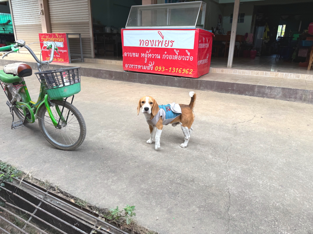 コンビニ横の市場のワンちゃん、服を着てました