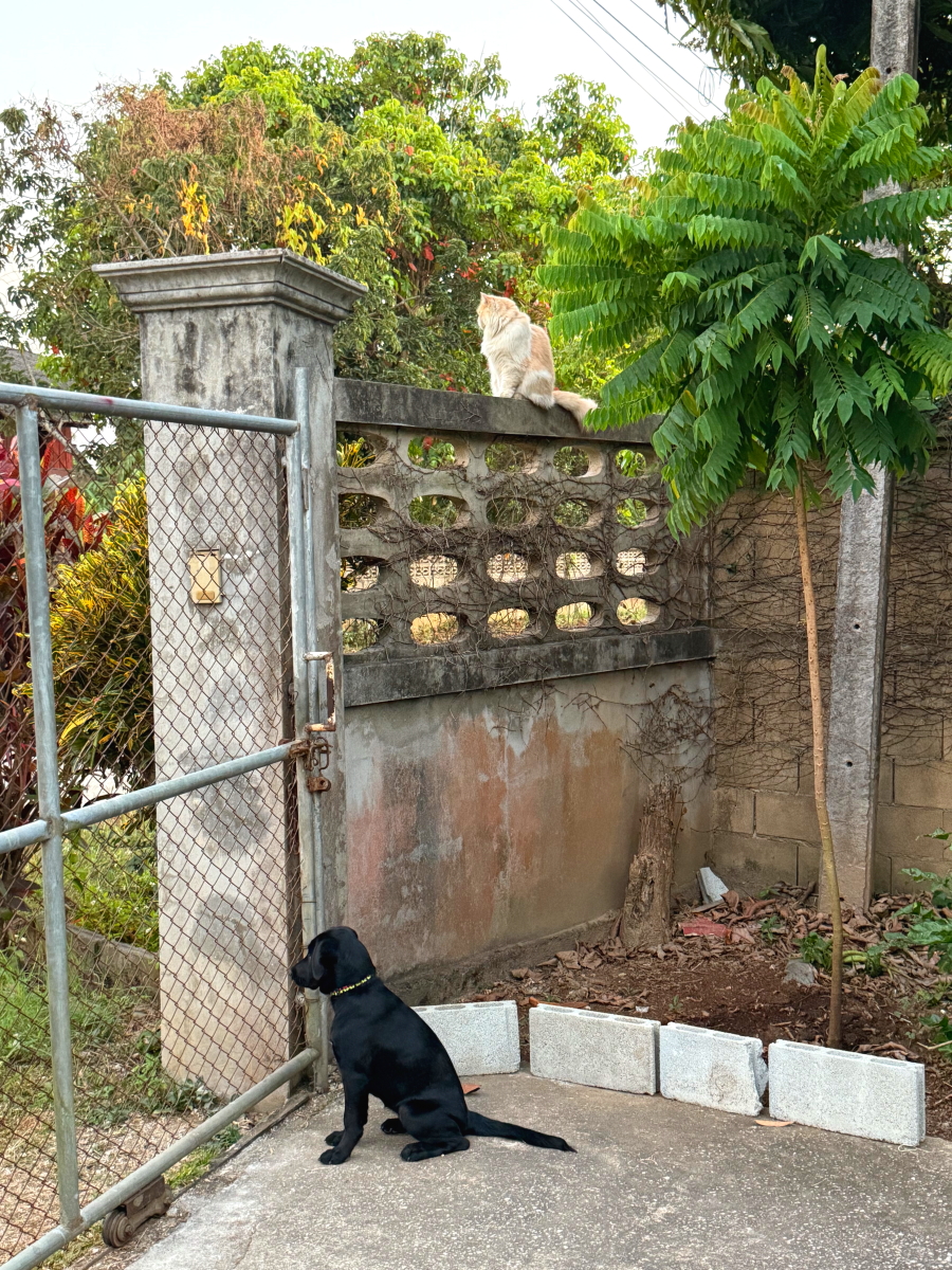 道路挟んだ向かいの家で音がしたので、上から猫ちゃん、地面でワンちゃんが監視しました