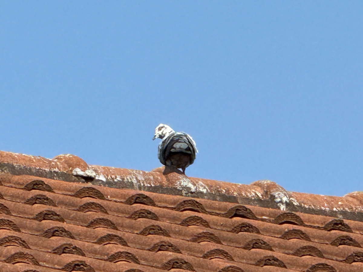 まだ産毛の鳩の子供が、1羽でやって来て屋根上を占拠