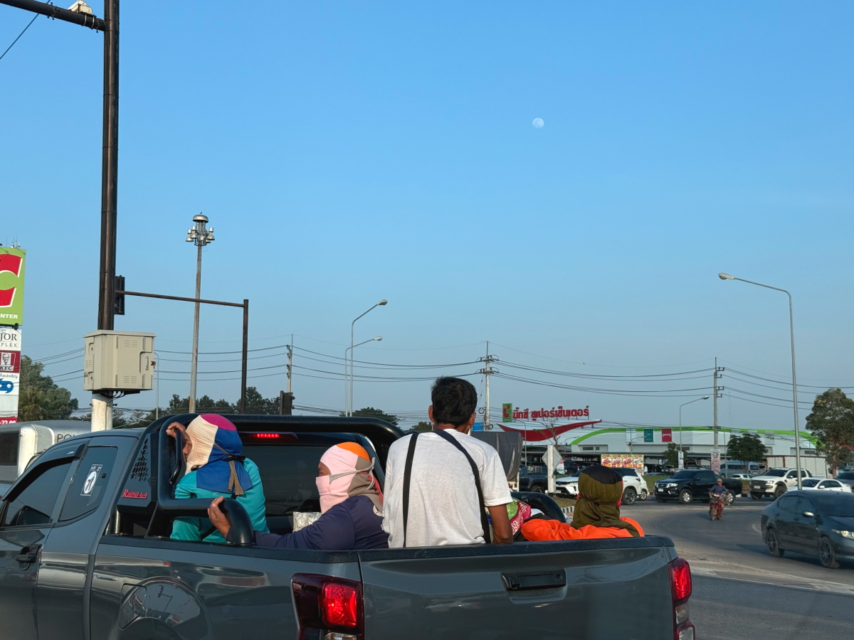 交差点で止まると、荷台乗車の車の向こうにお月様が浮かびました