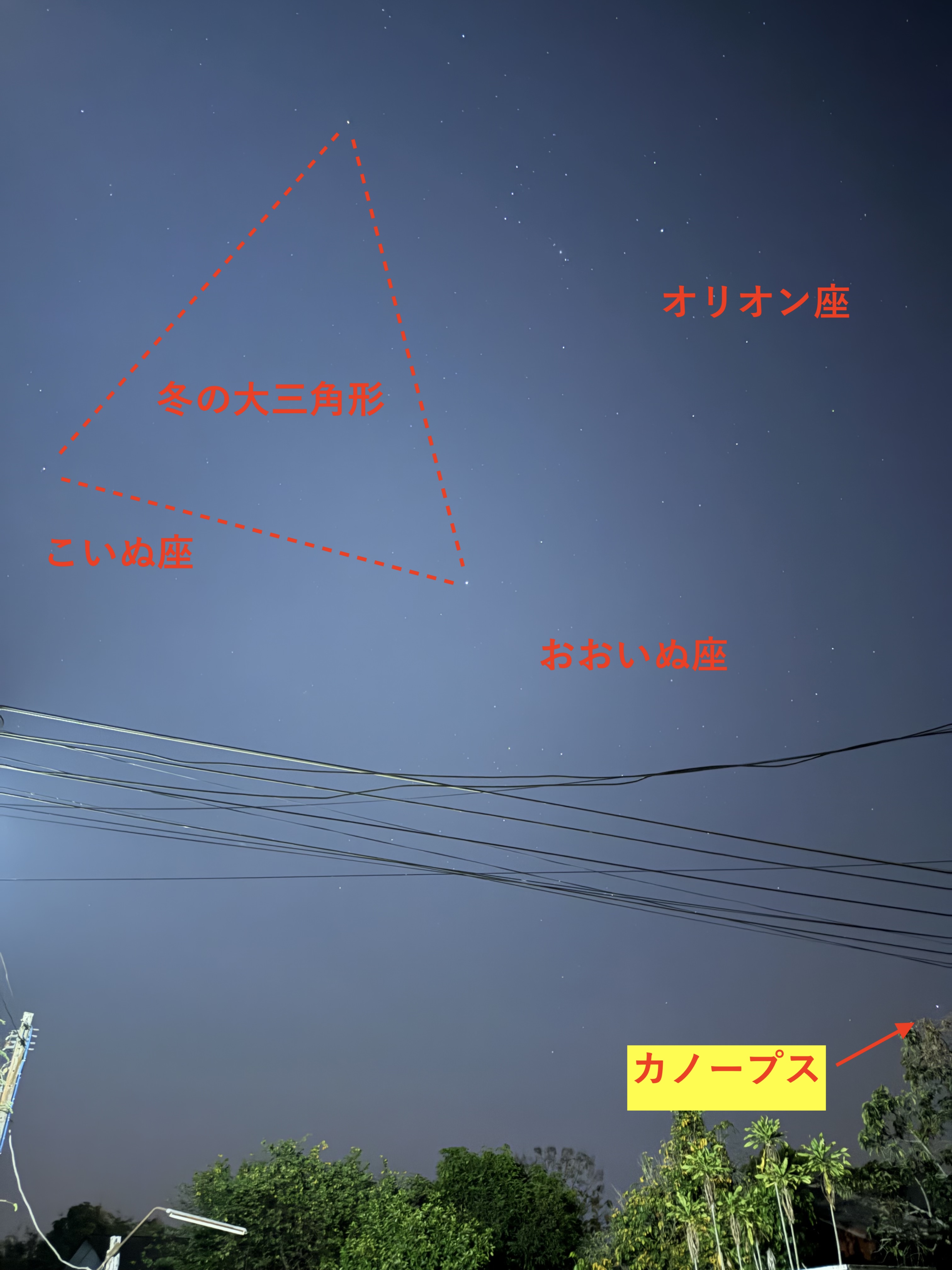 いつもの星空、冬の大三角形とカノープスを同じ画面に入れて見ました