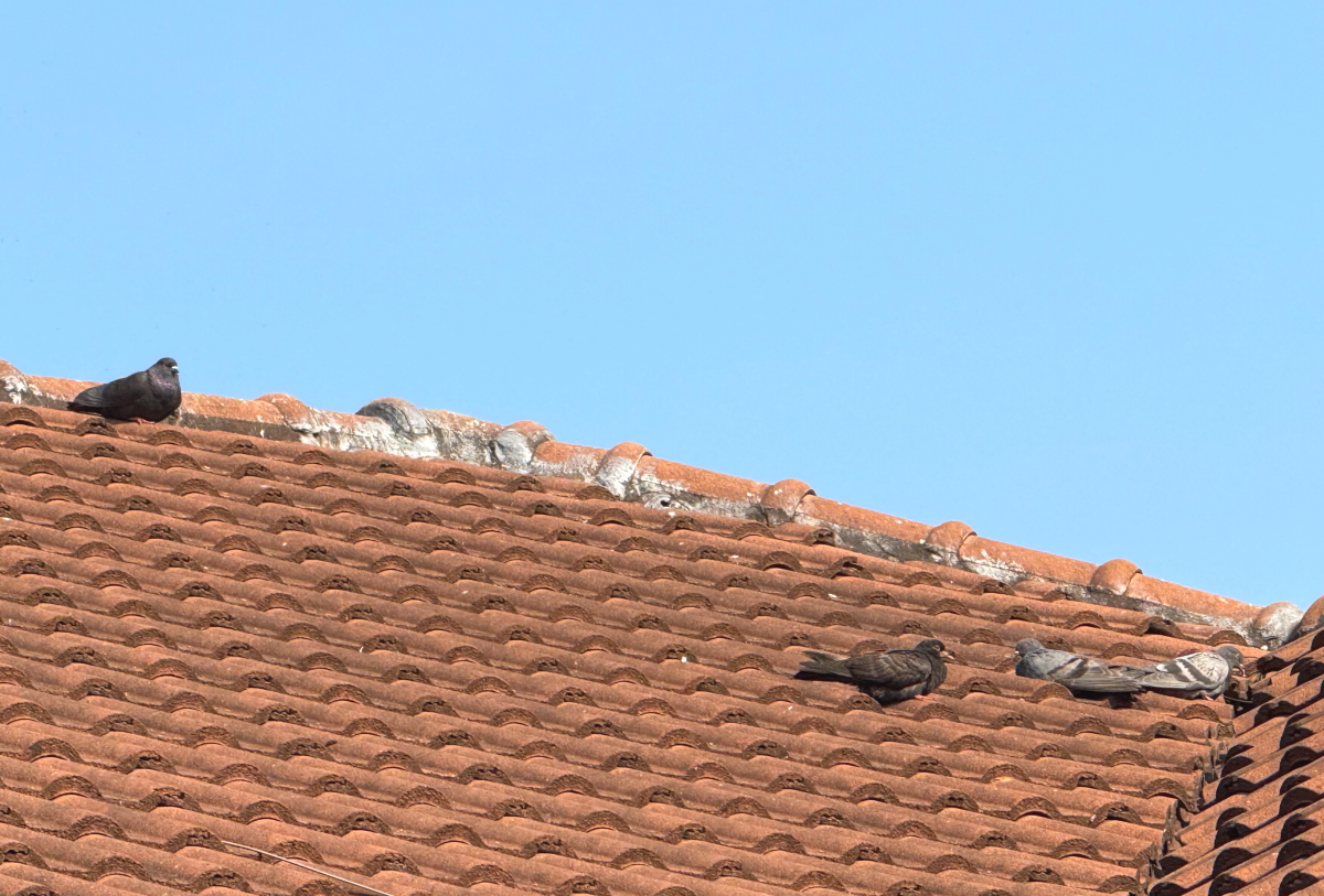 屋根の鳩たちは、斜面で居心地が悪そう