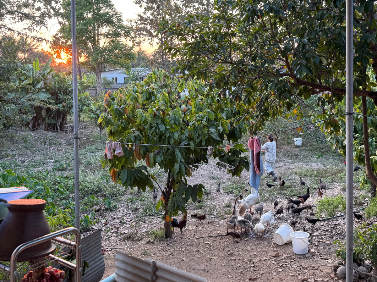 日没時の餌の時間に集まる、鶏とアヒルたち