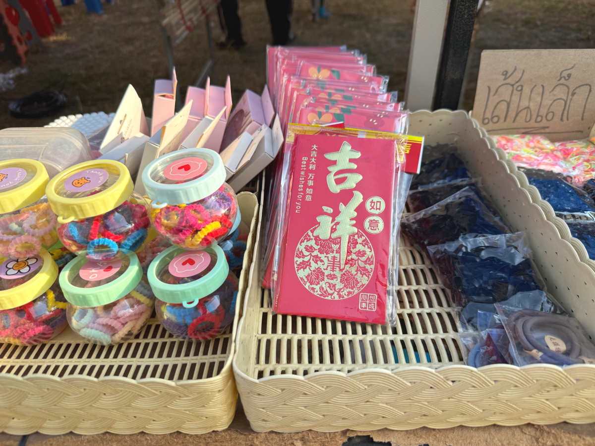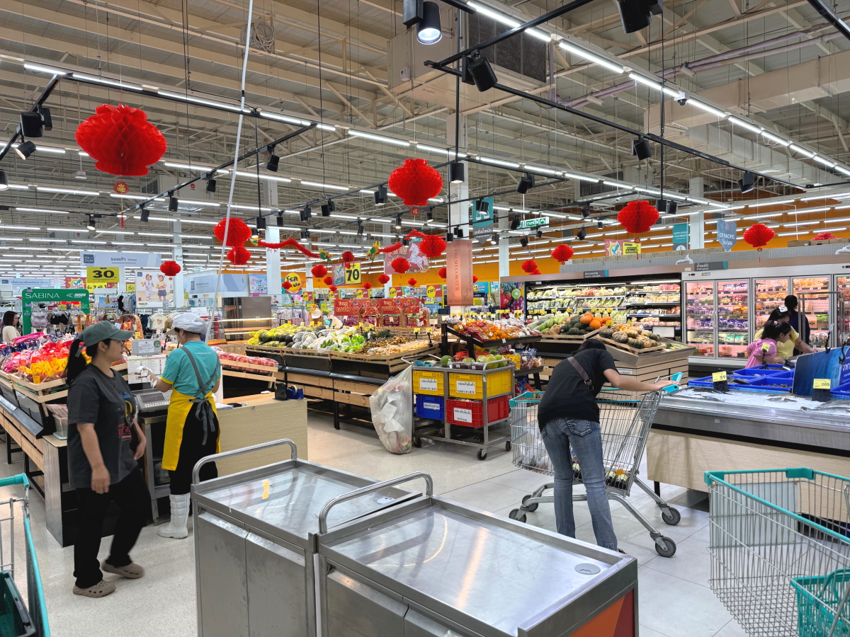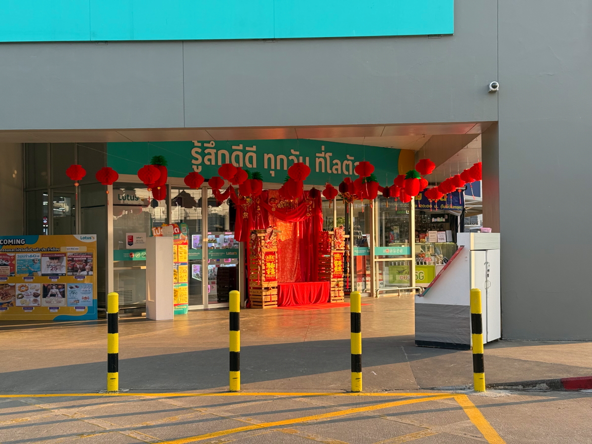 入り口の中国系お飾りに西陽が当たって色鮮やか