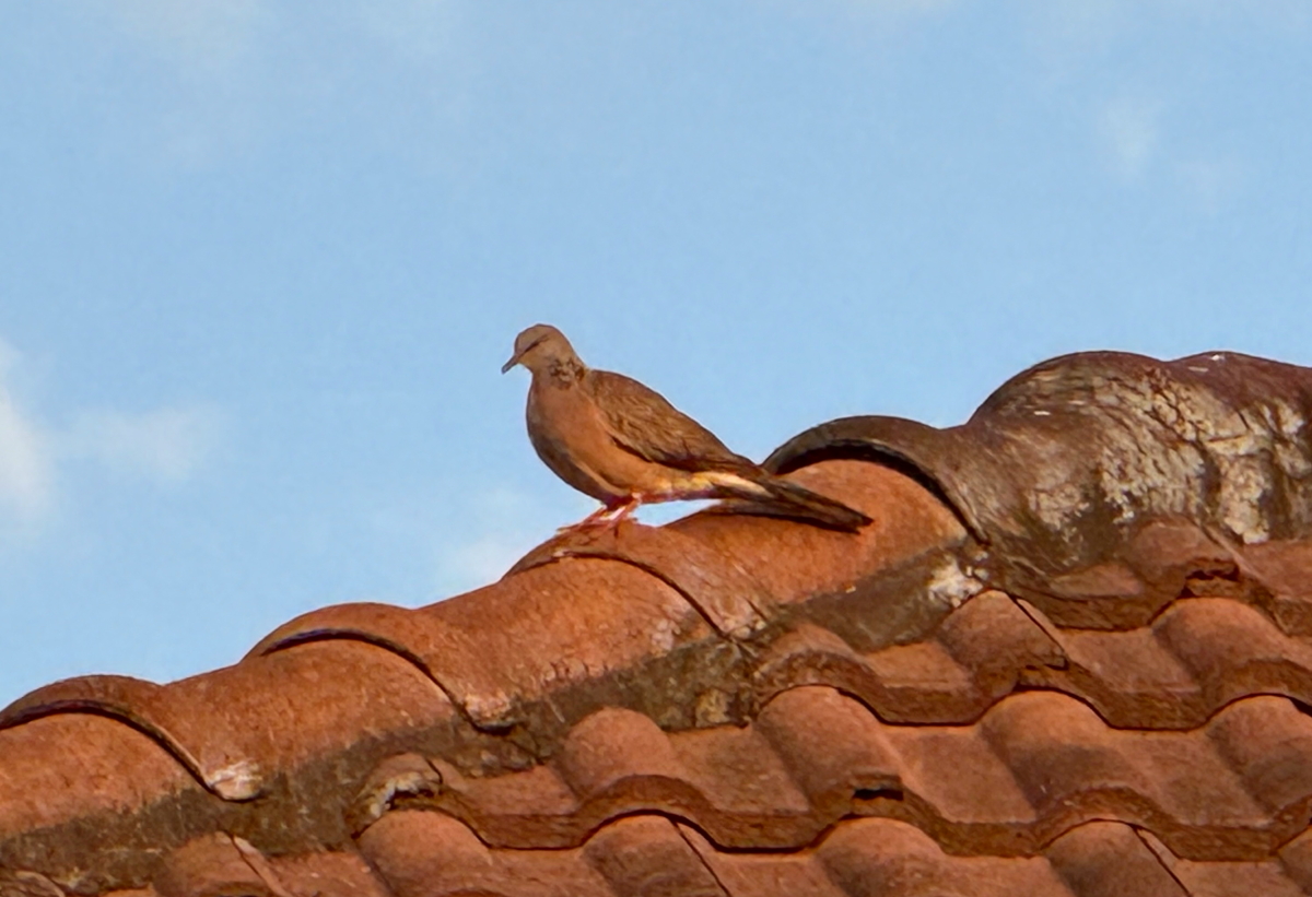 屋根上の鳩の中に、産毛の小鳩が居ました(犬にやられてませんでしたね)