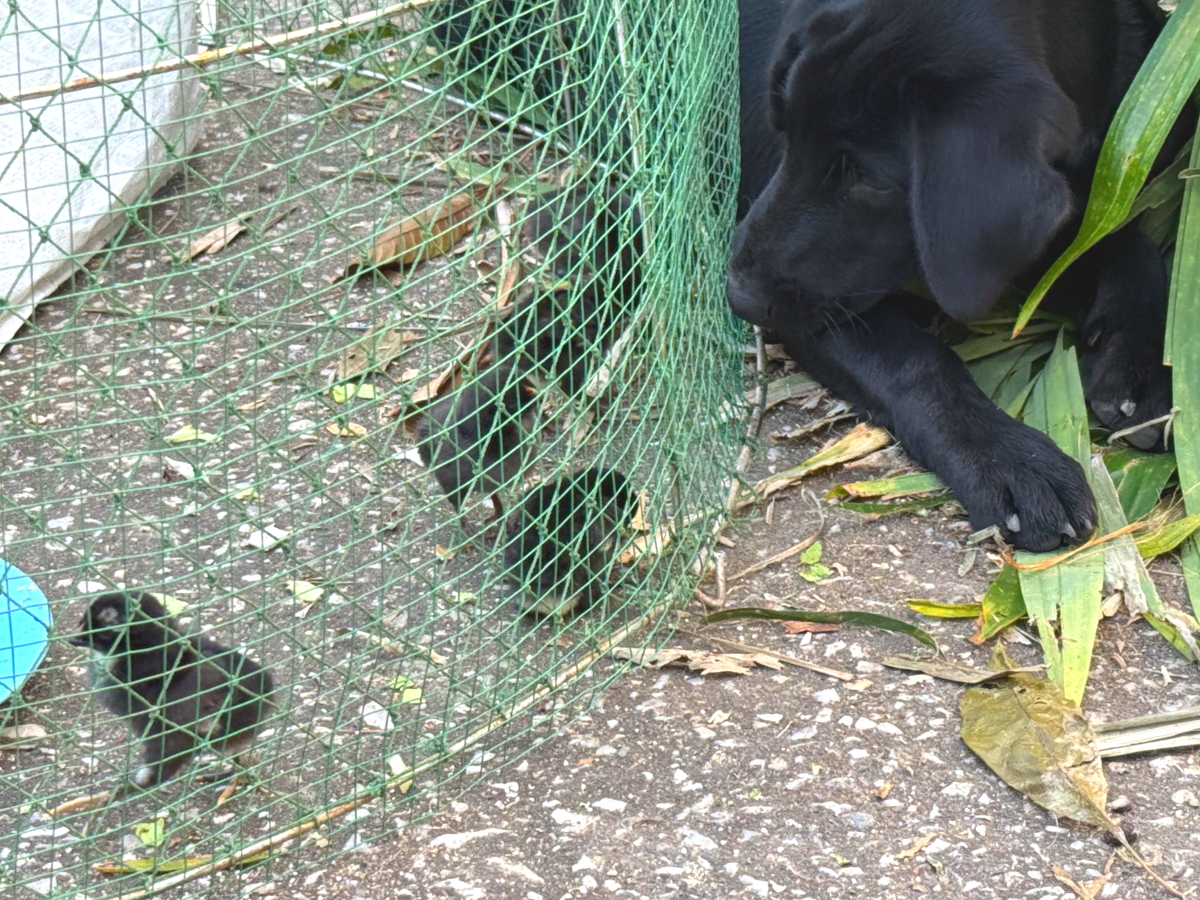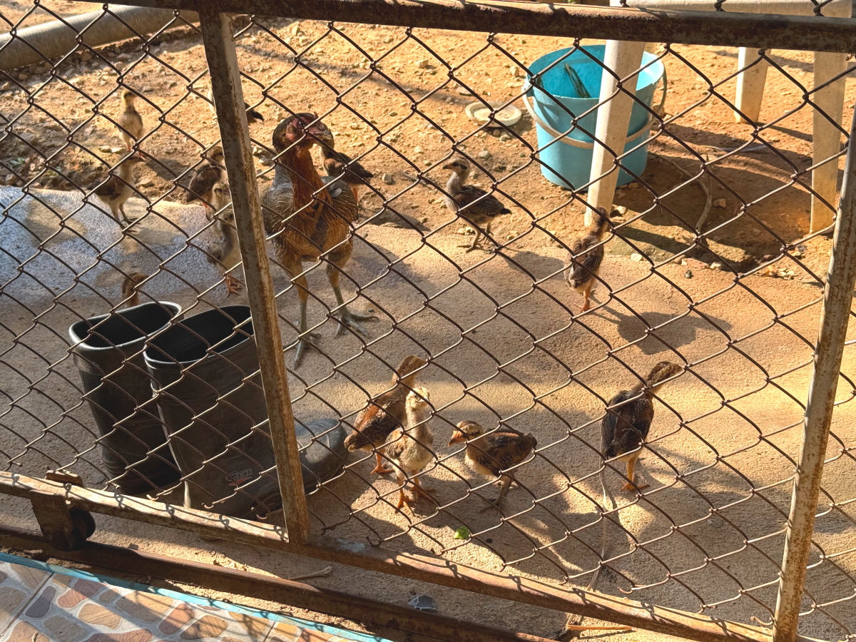 裏庭では鶏の雛が餌のおねだりで大騒ぎ
