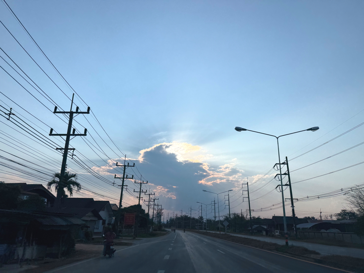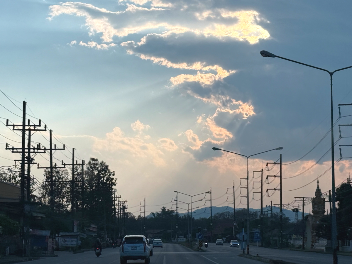 国道を南下すると、西の空の雲から太陽の足が綺麗に伸びました