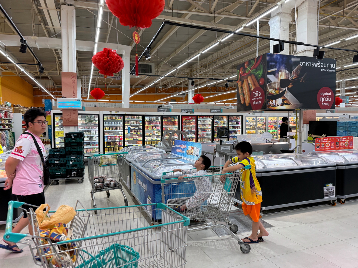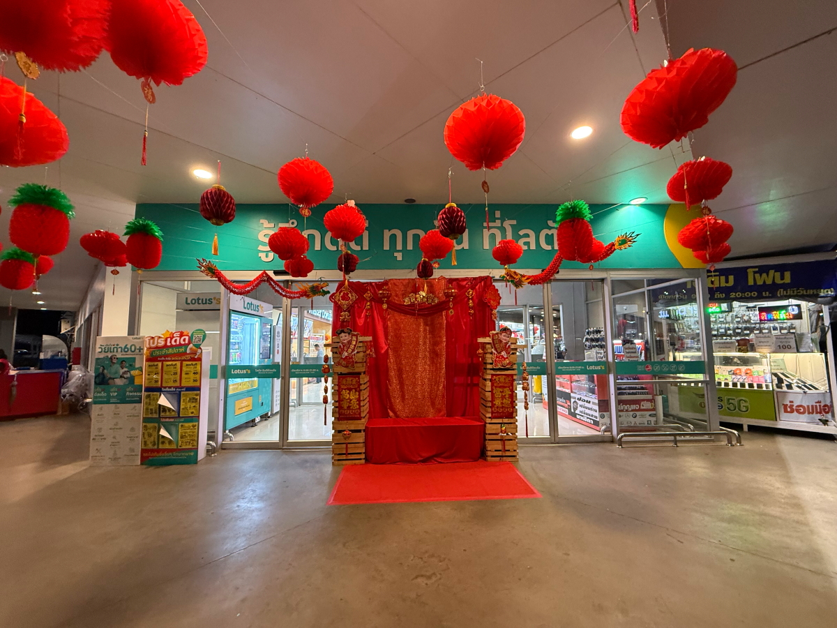 いつものスーパー、入り口の中国の旧正月飾り付けが見事です