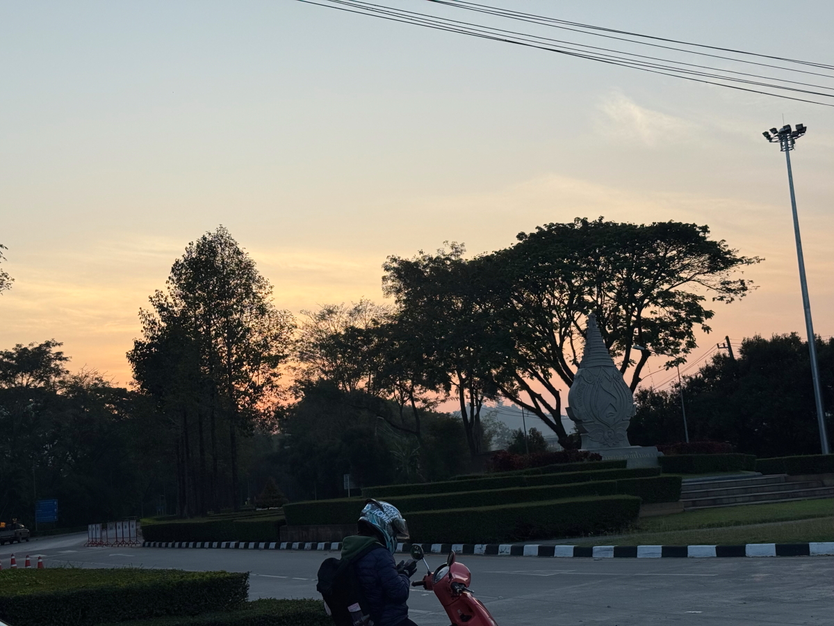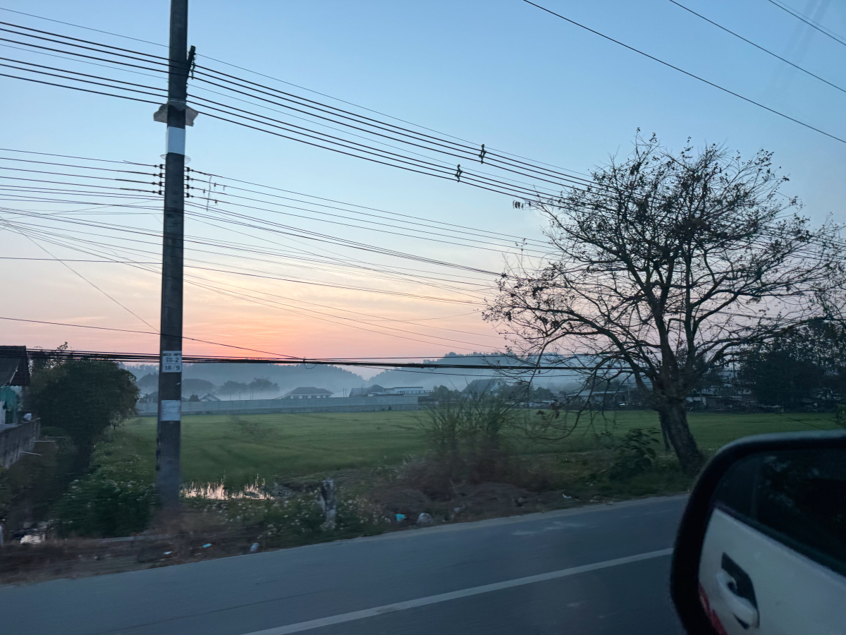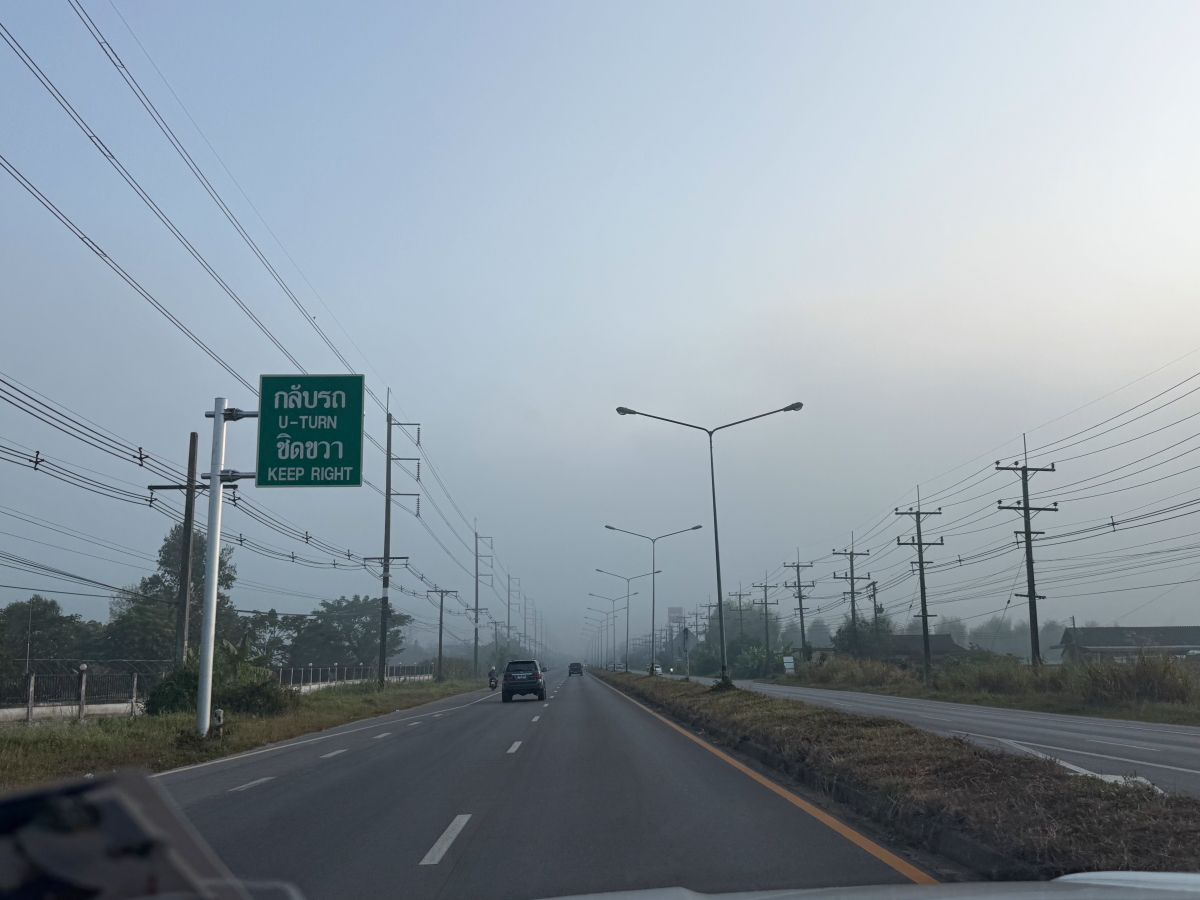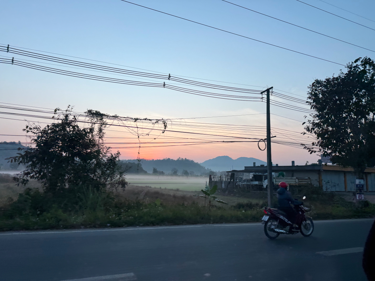 メーチャン市街を抜けて郊外に進むと、まだ霧の朝です