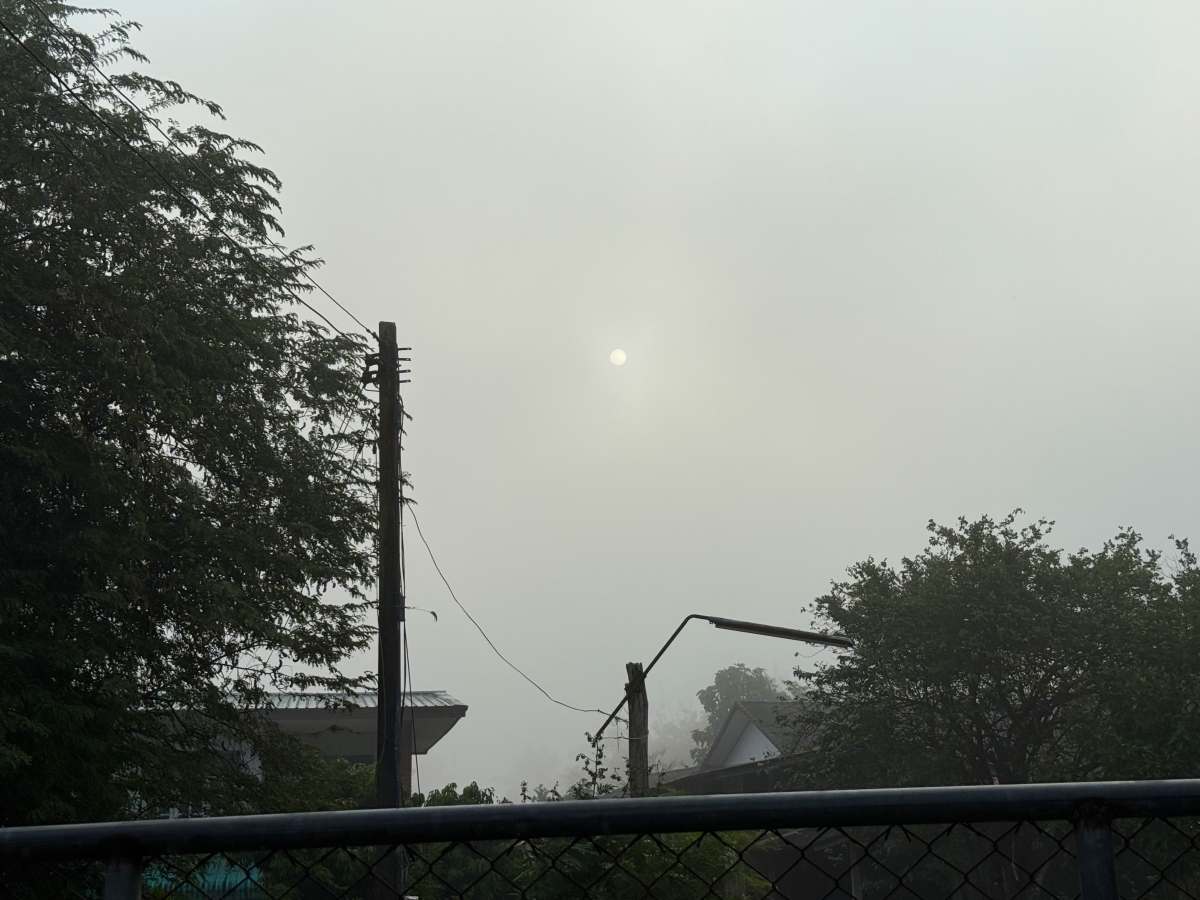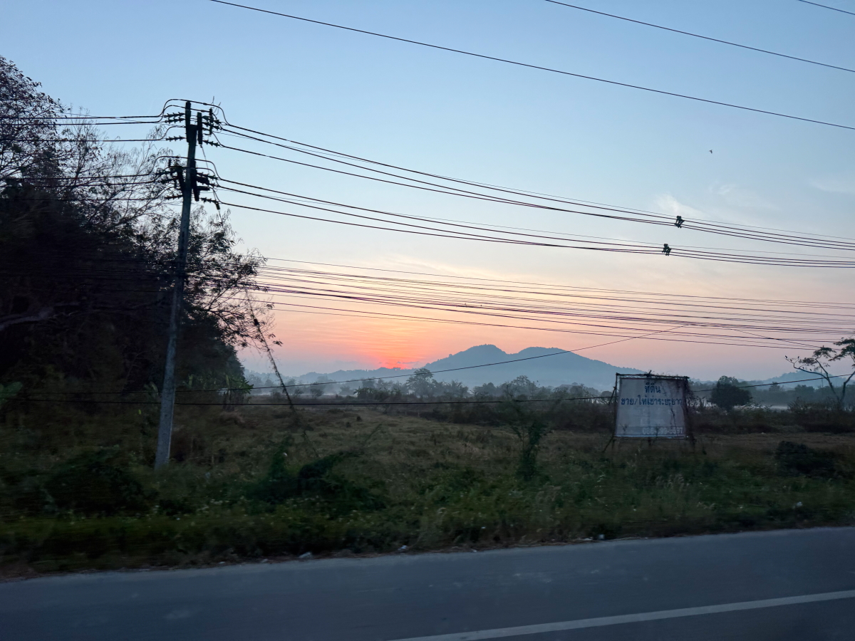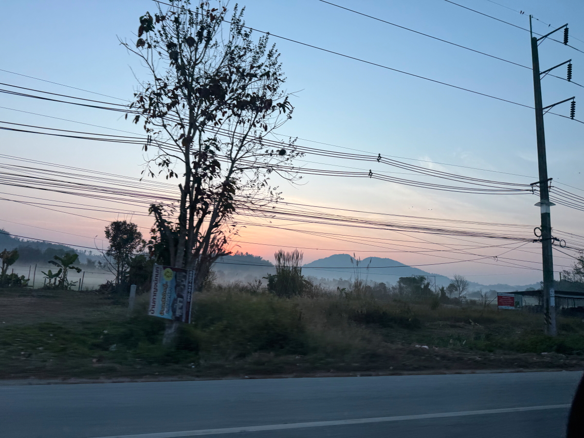 夜明け前の国道を南下して飛行場に向かいます・・・空気が霞む前ですが、地表の霧で山々はこんな見え方
