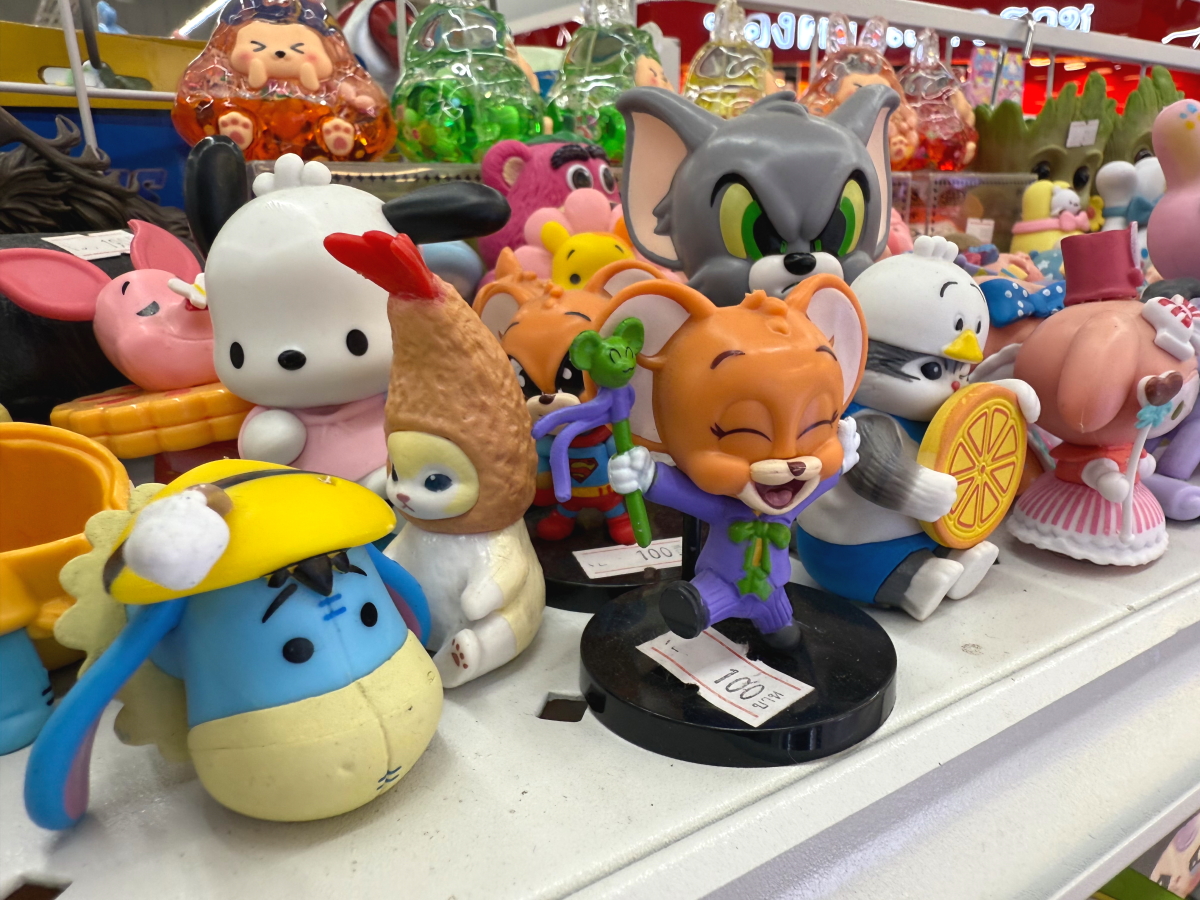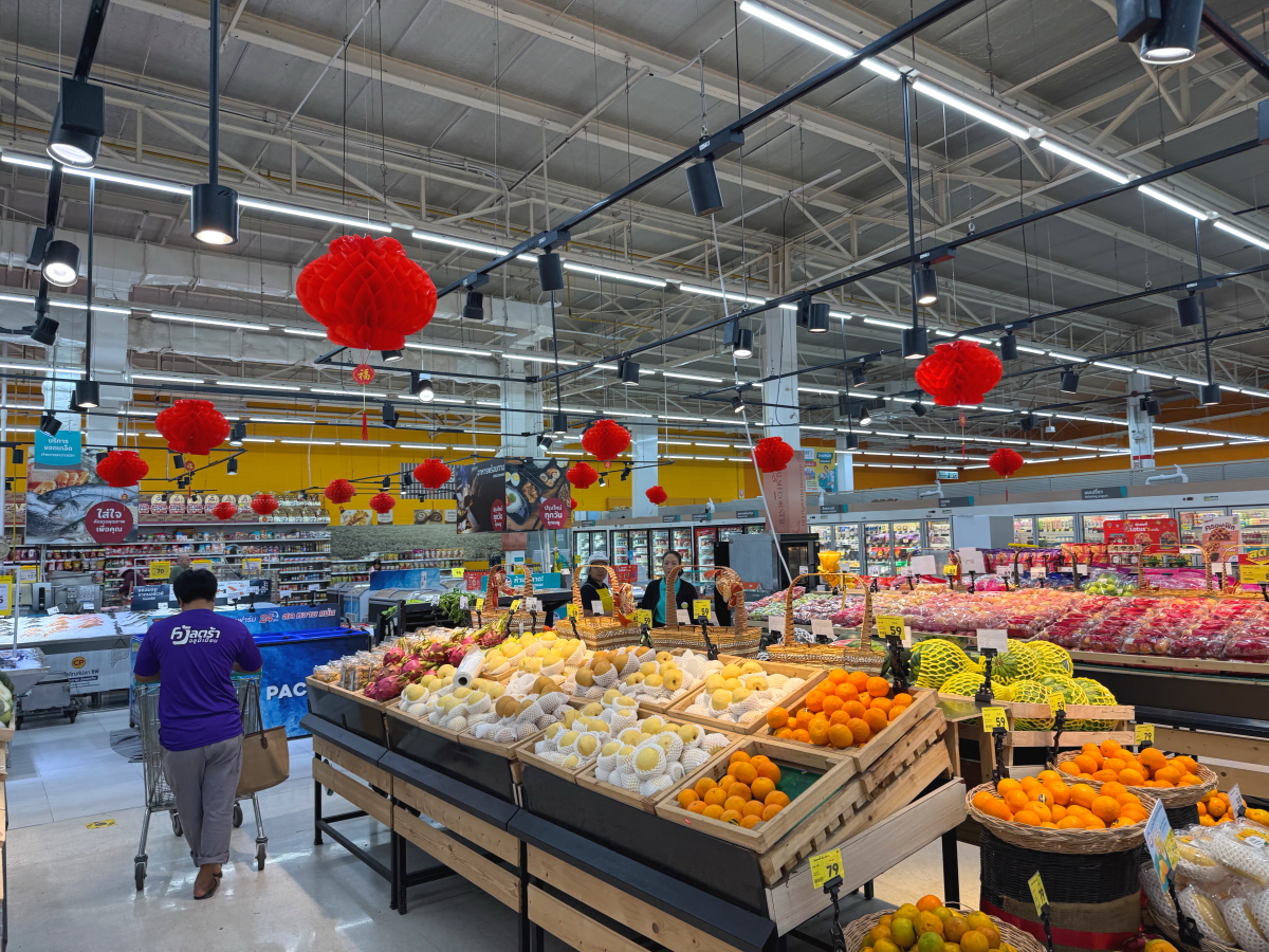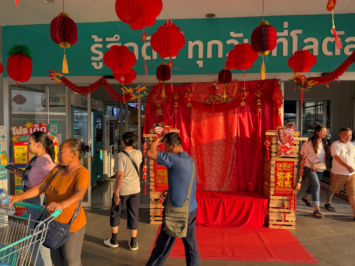 スーパー入り口、中国お正月の飾り付けにも西陽が当たってます