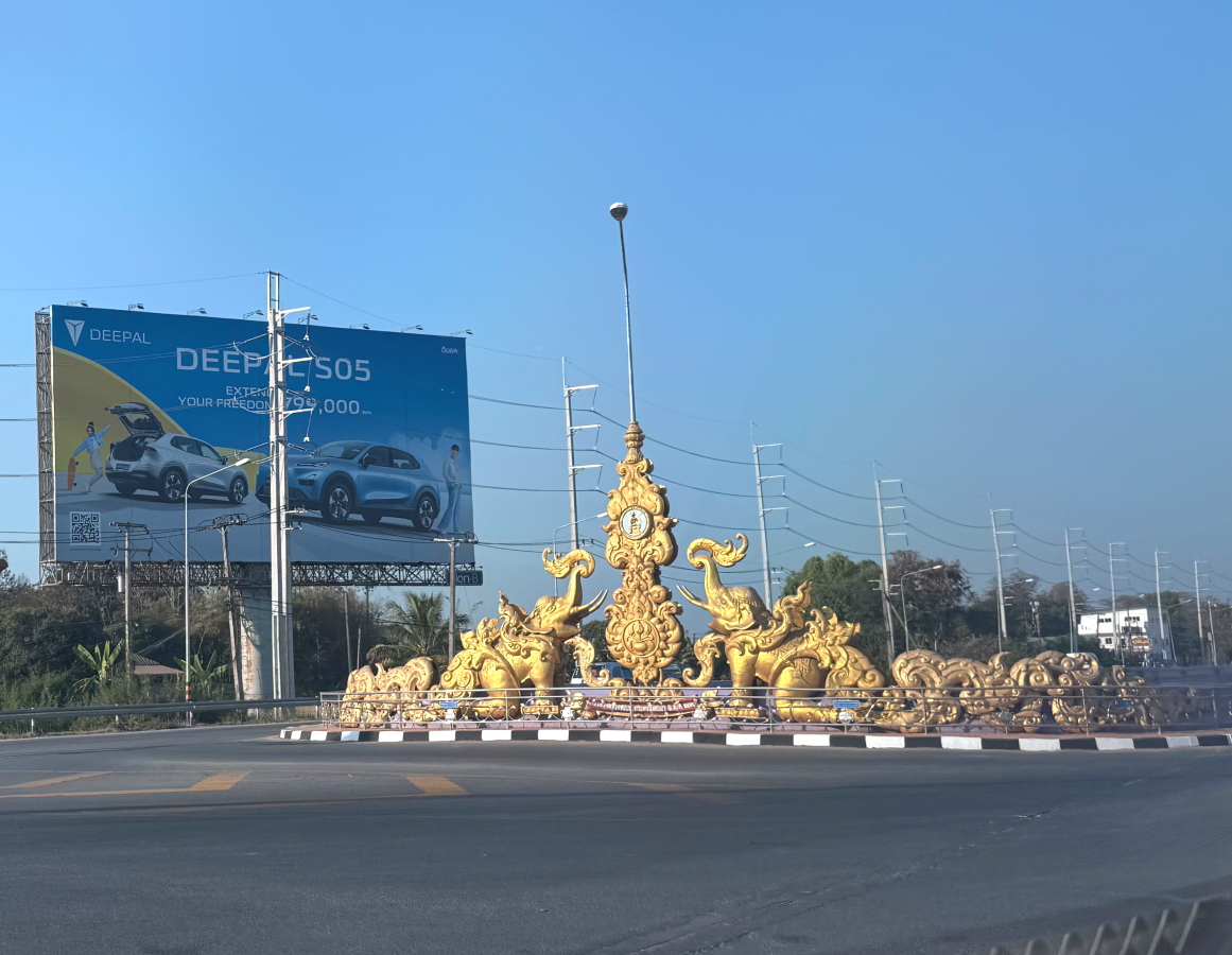 飛行場の目の前、仏教的オブジェに西陽が当たって象さんがキラリ