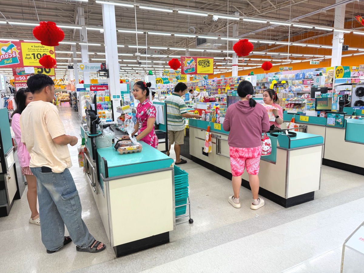 レジのお姉さんは、中国の旧正月に合わせてチャイナドレス