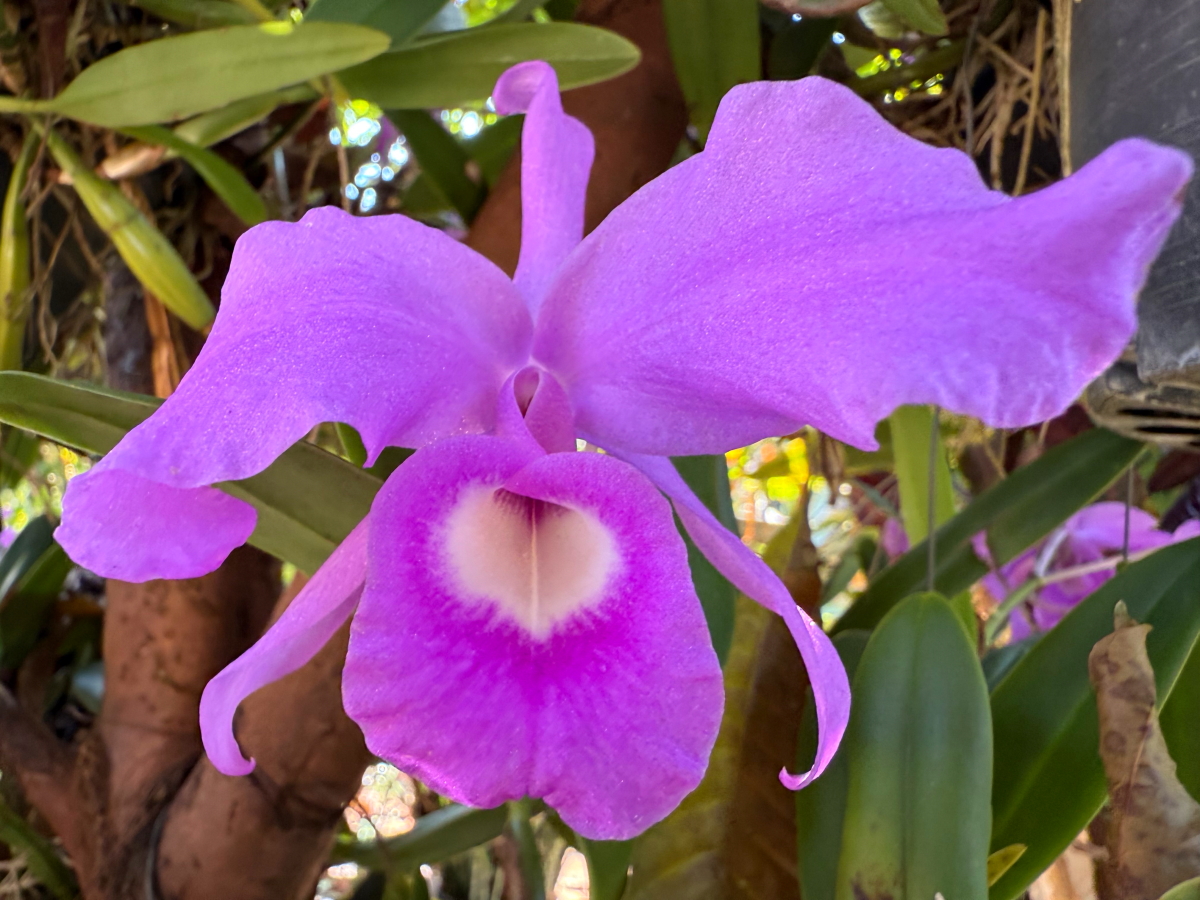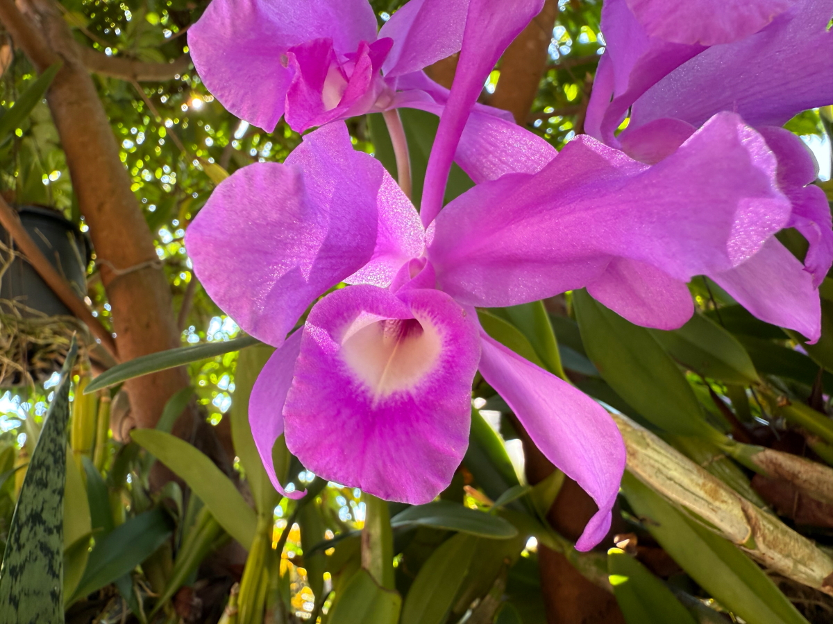 庭の蘭に日中の陽射しが当たって輝いてます
