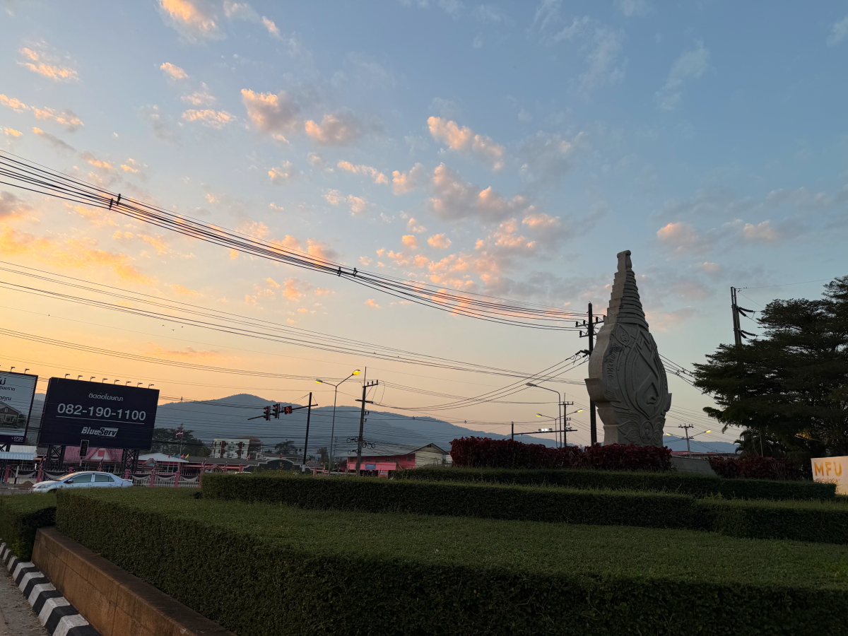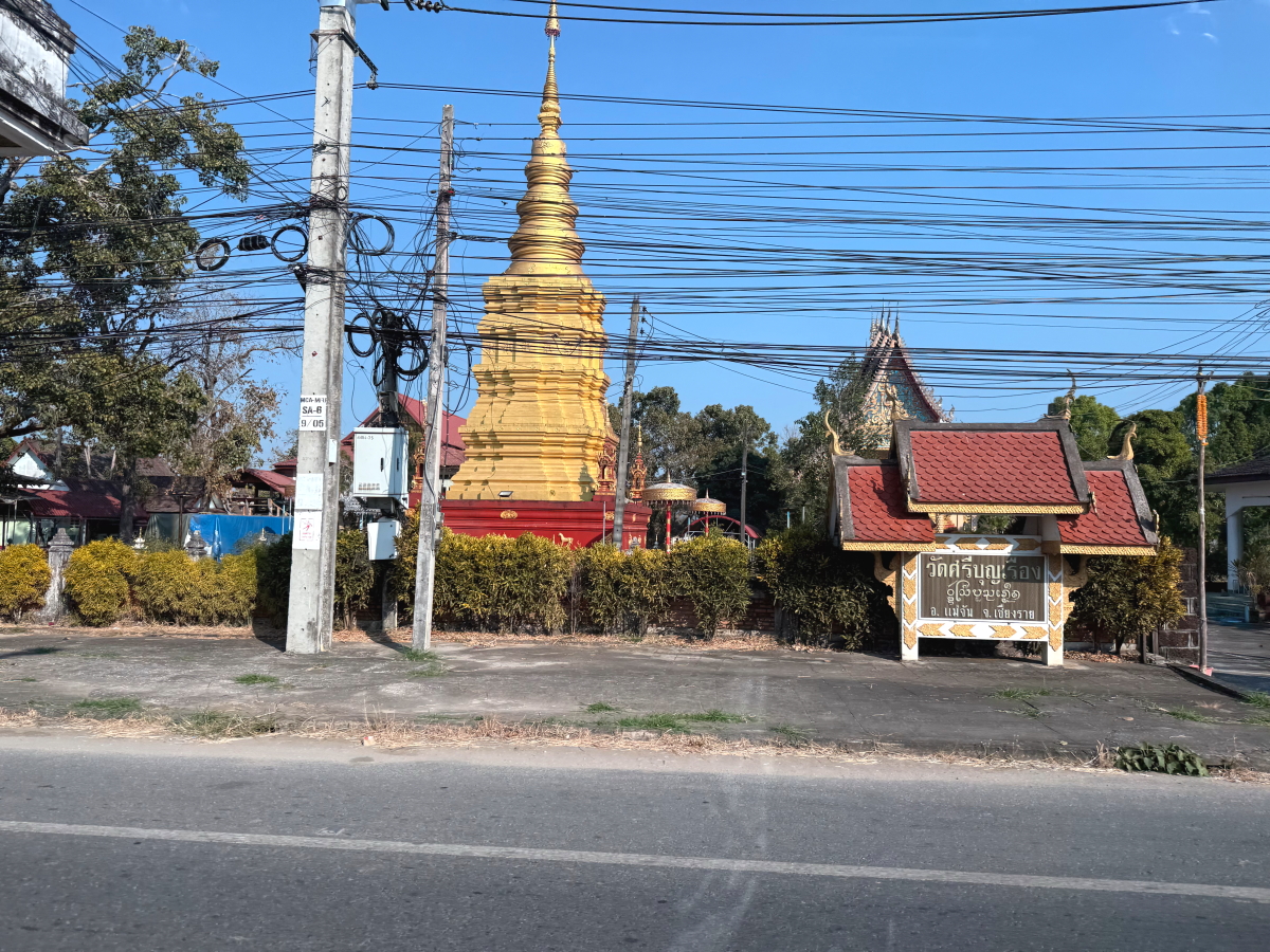 メーチャンの街の国道沿いのお寺に午後の陽射しが当たって仏舎利塔が輝きました