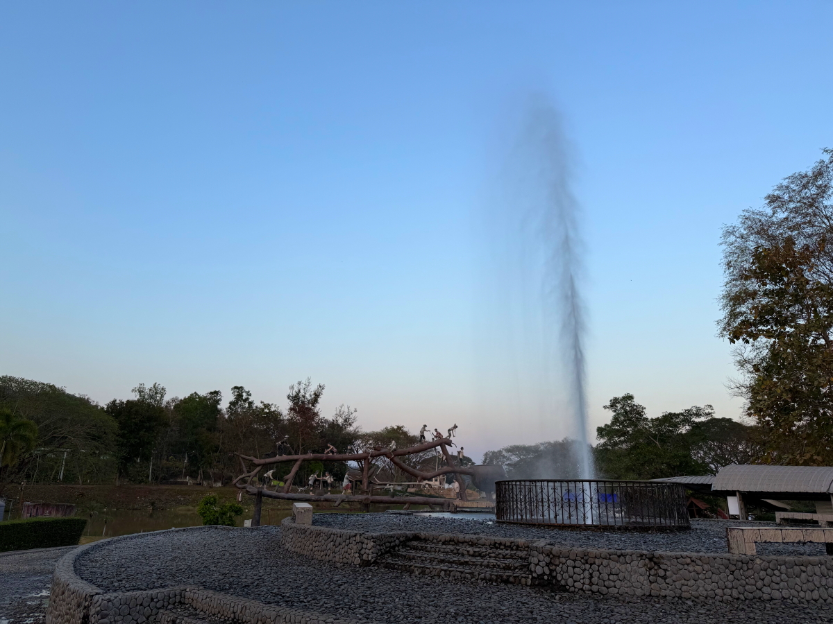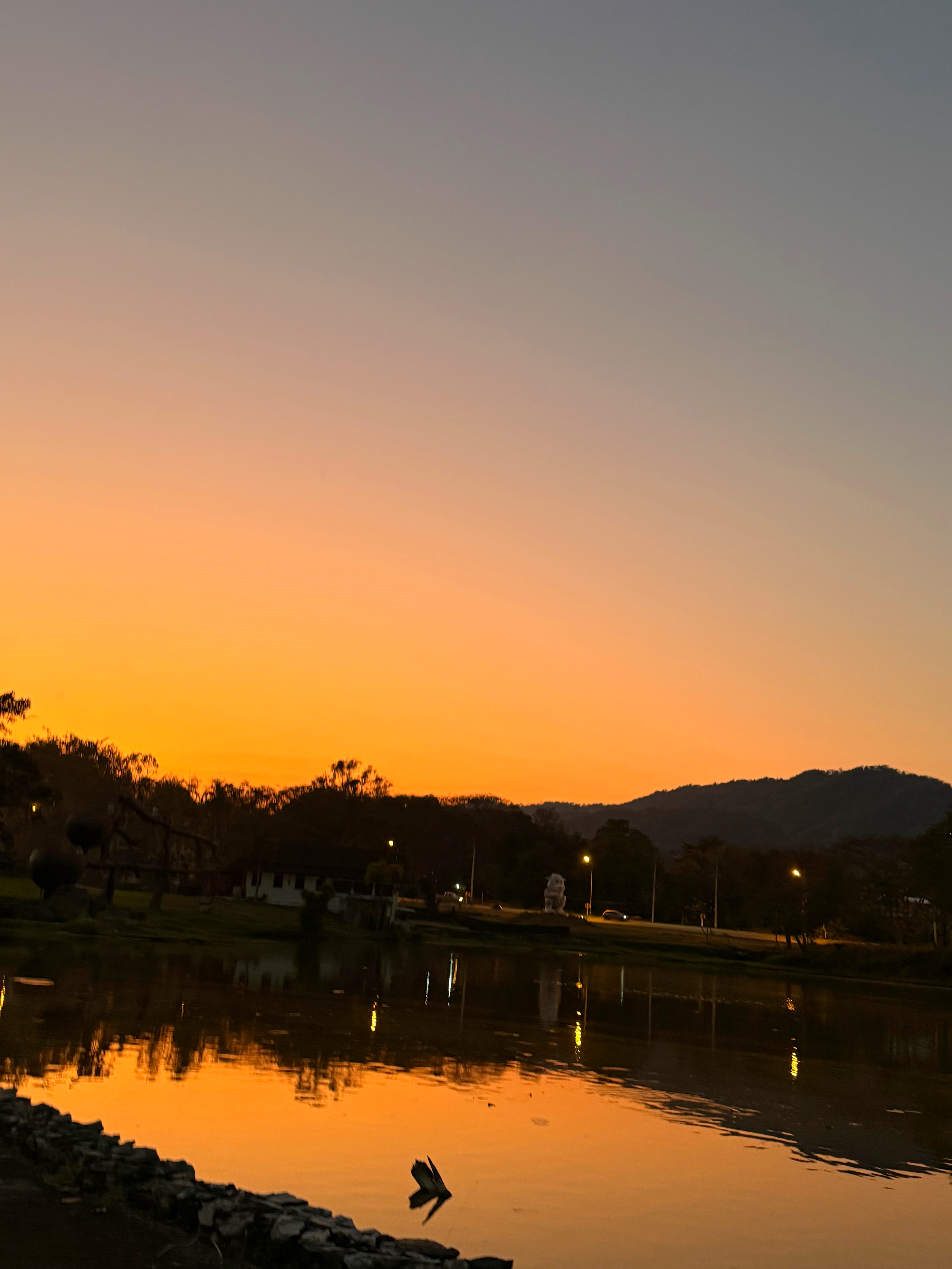 オレンジの夕焼けが噴水の後ろで綺麗に焼けてました