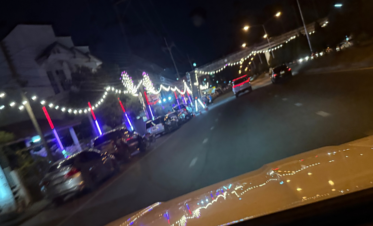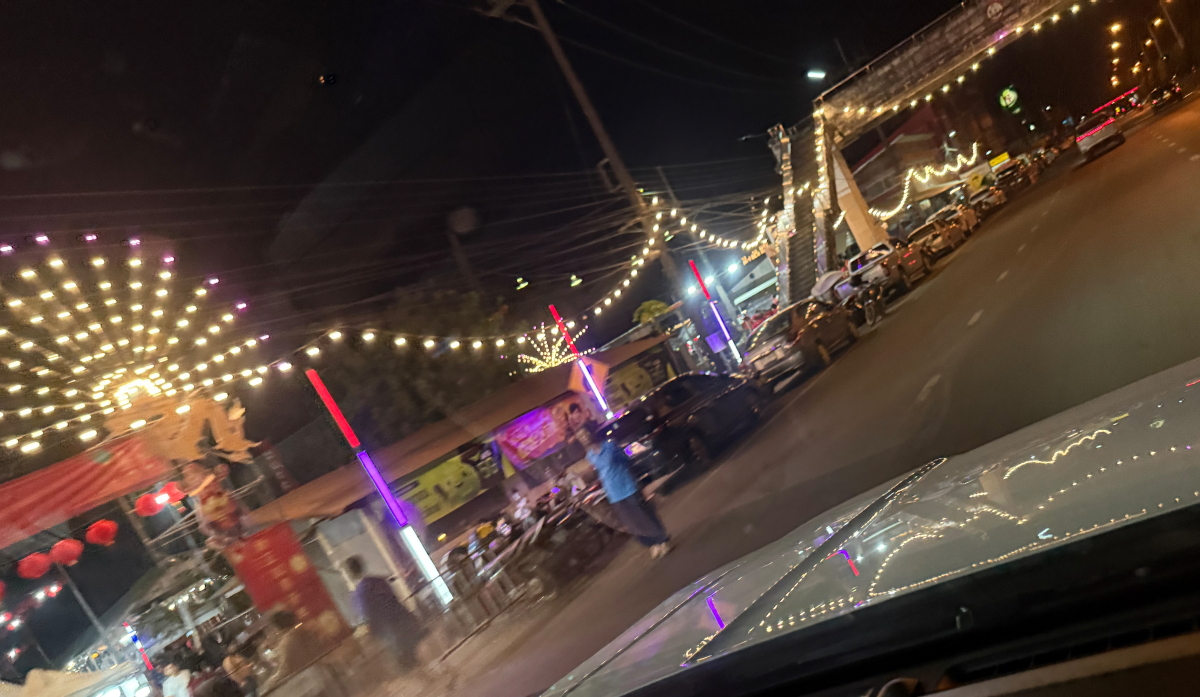 帰りのメーチャン市内の市場は、中国のお正月に合わせて派手にライトアップ