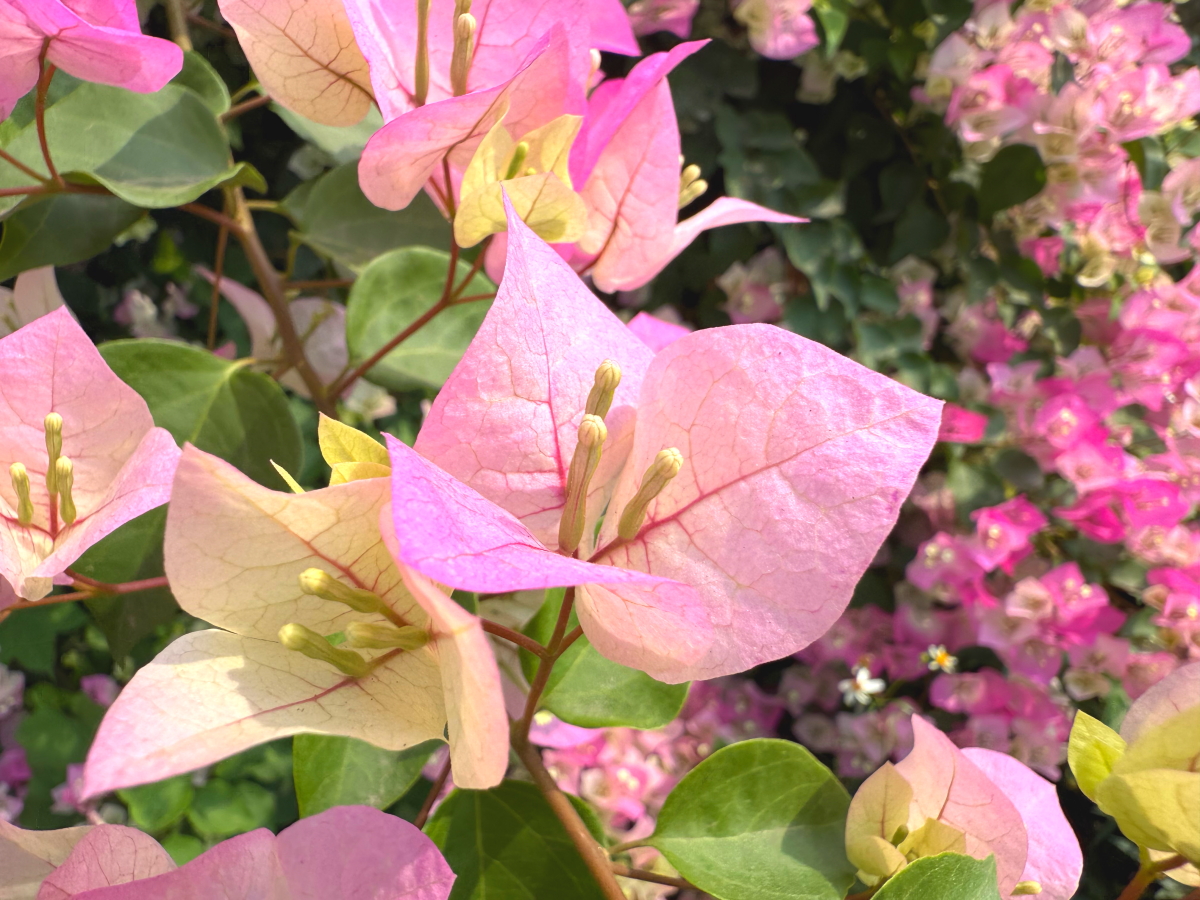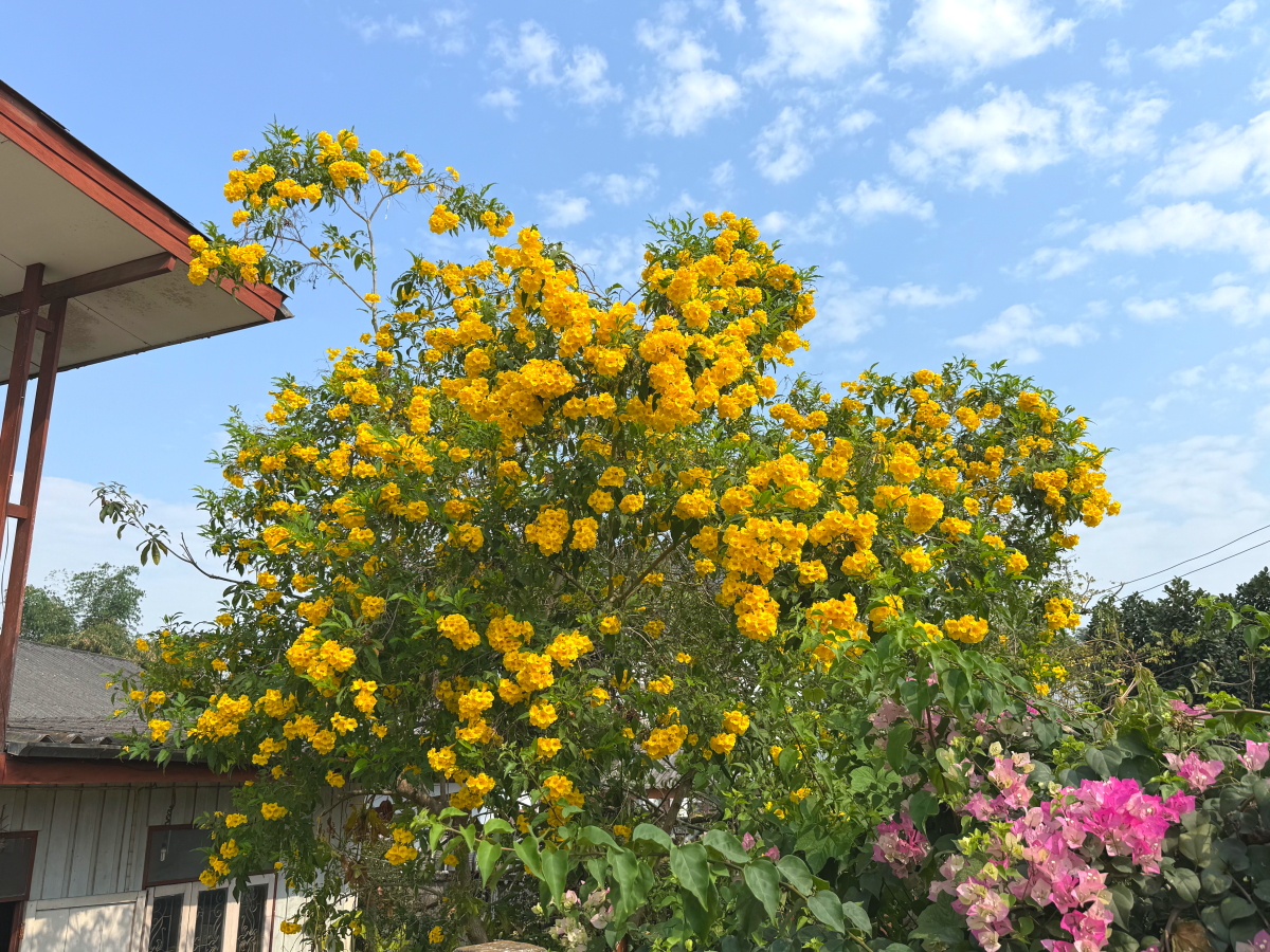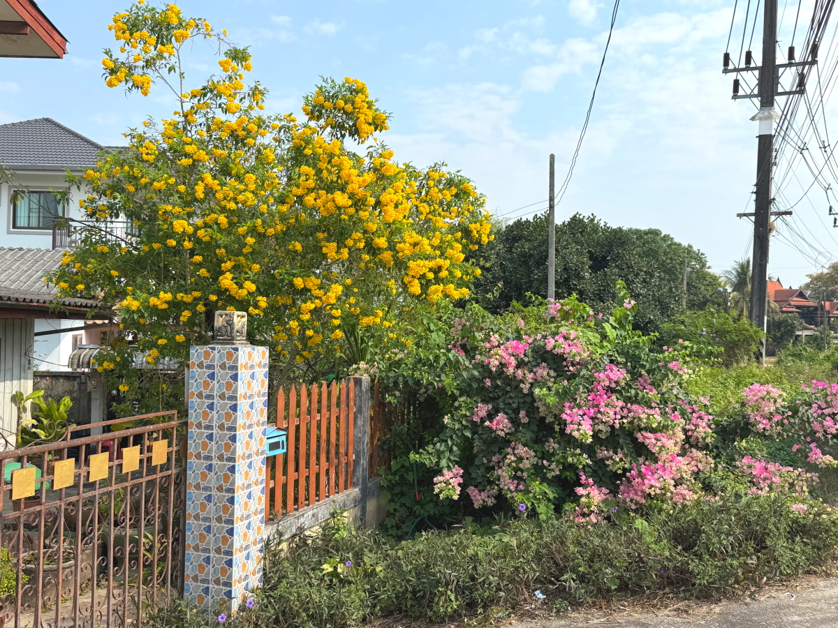 仏壇の後ろに見えた民家のお花が庭から溢れて綺麗に咲いてました