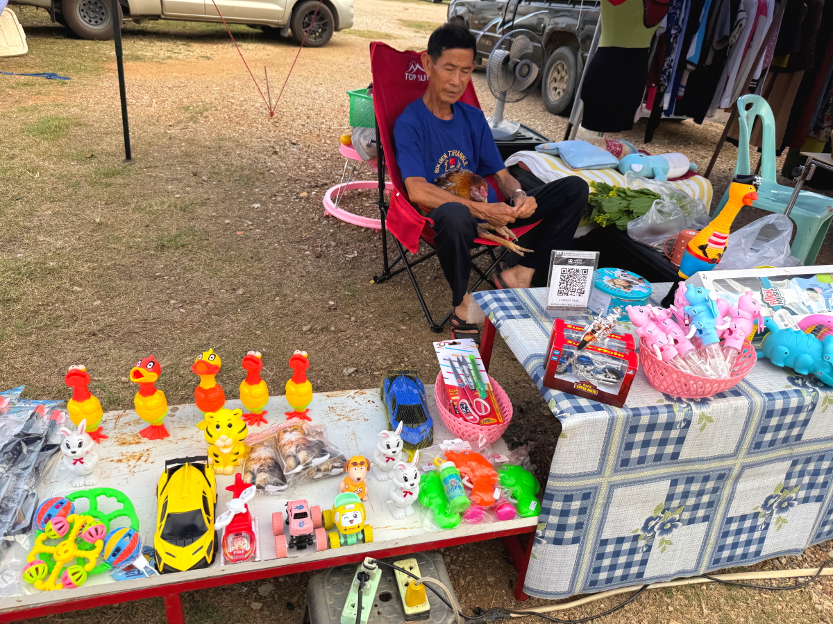 玩具屋さんのご主人、膝の上には本物の生きたニワトリが乗ってます