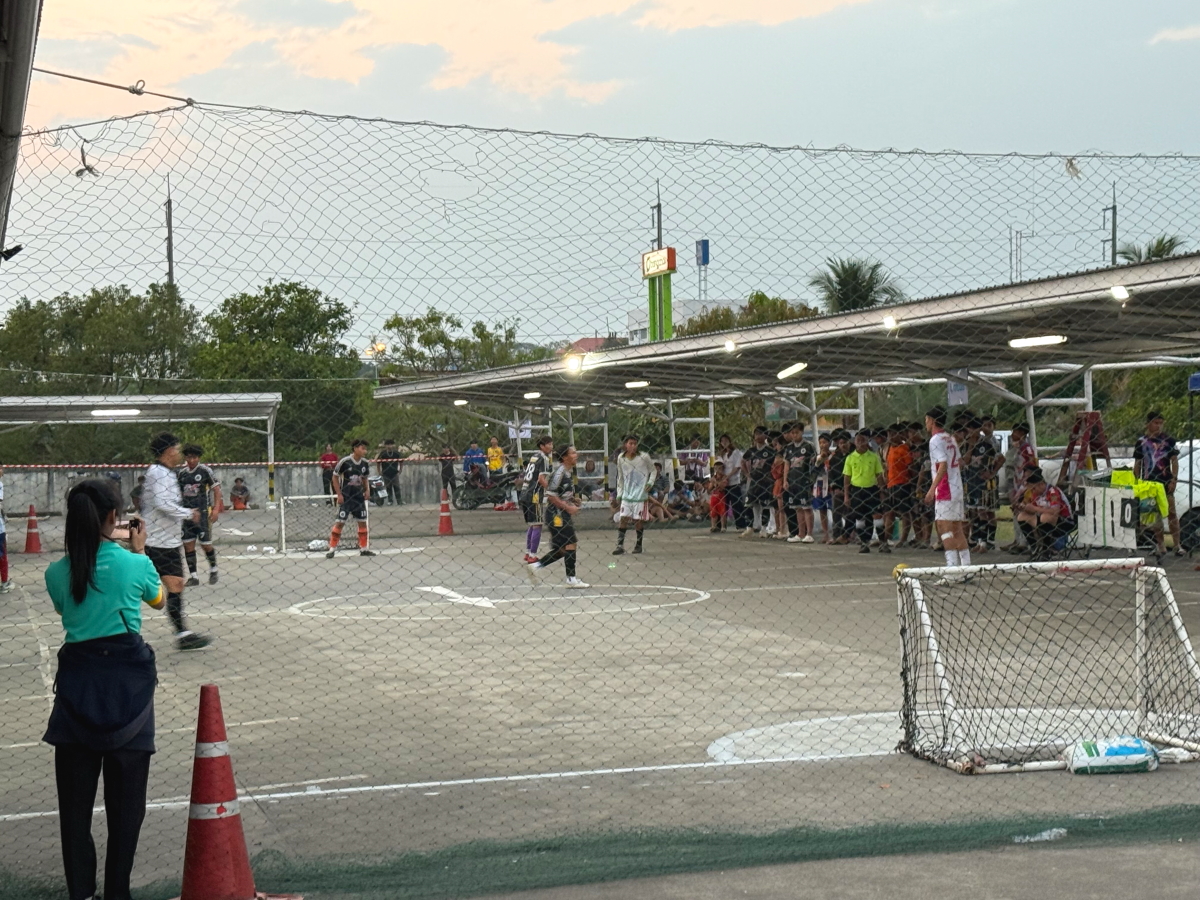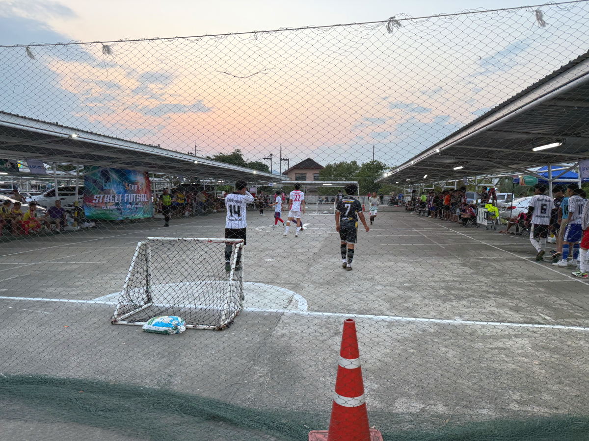 田んぼに面した駐車場では、ミニサッカーのゲーム中