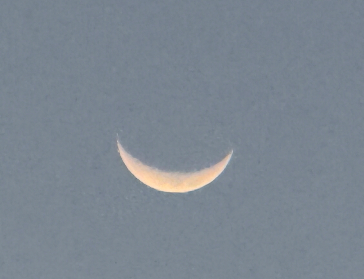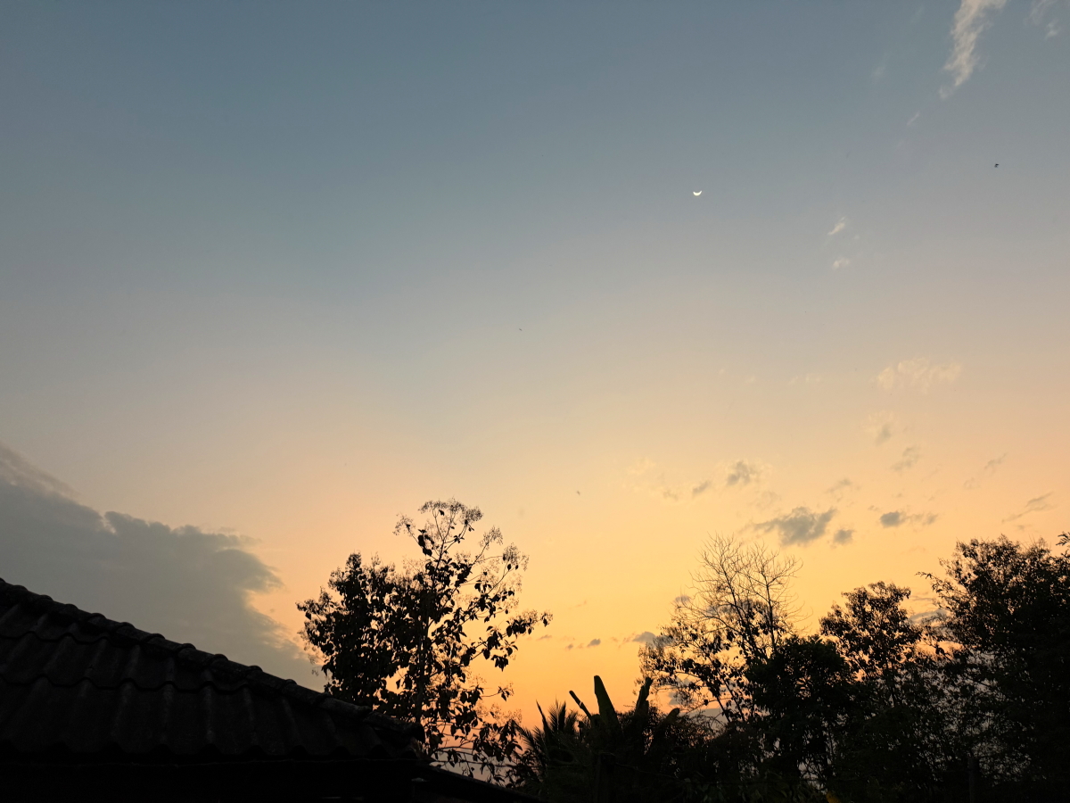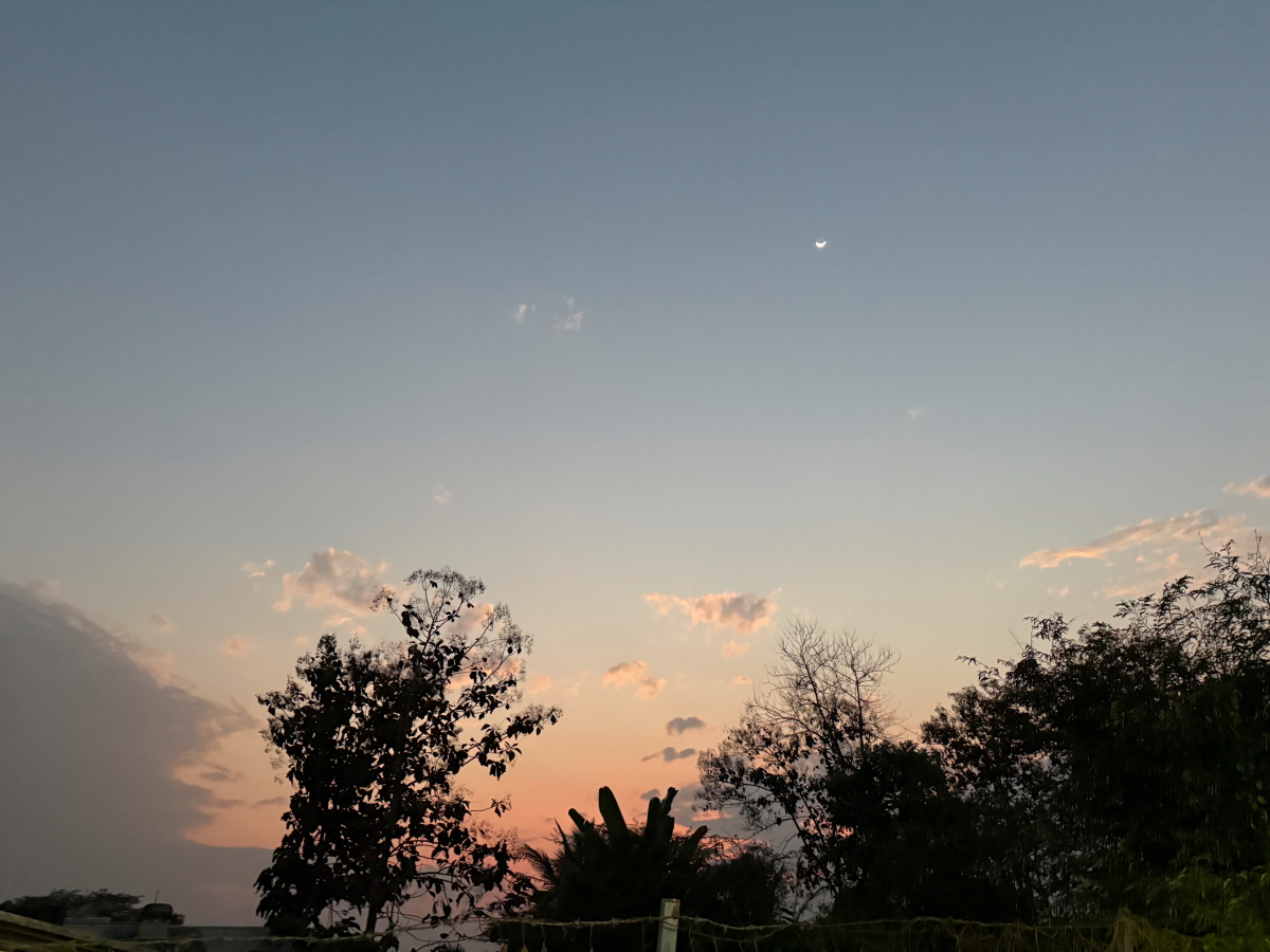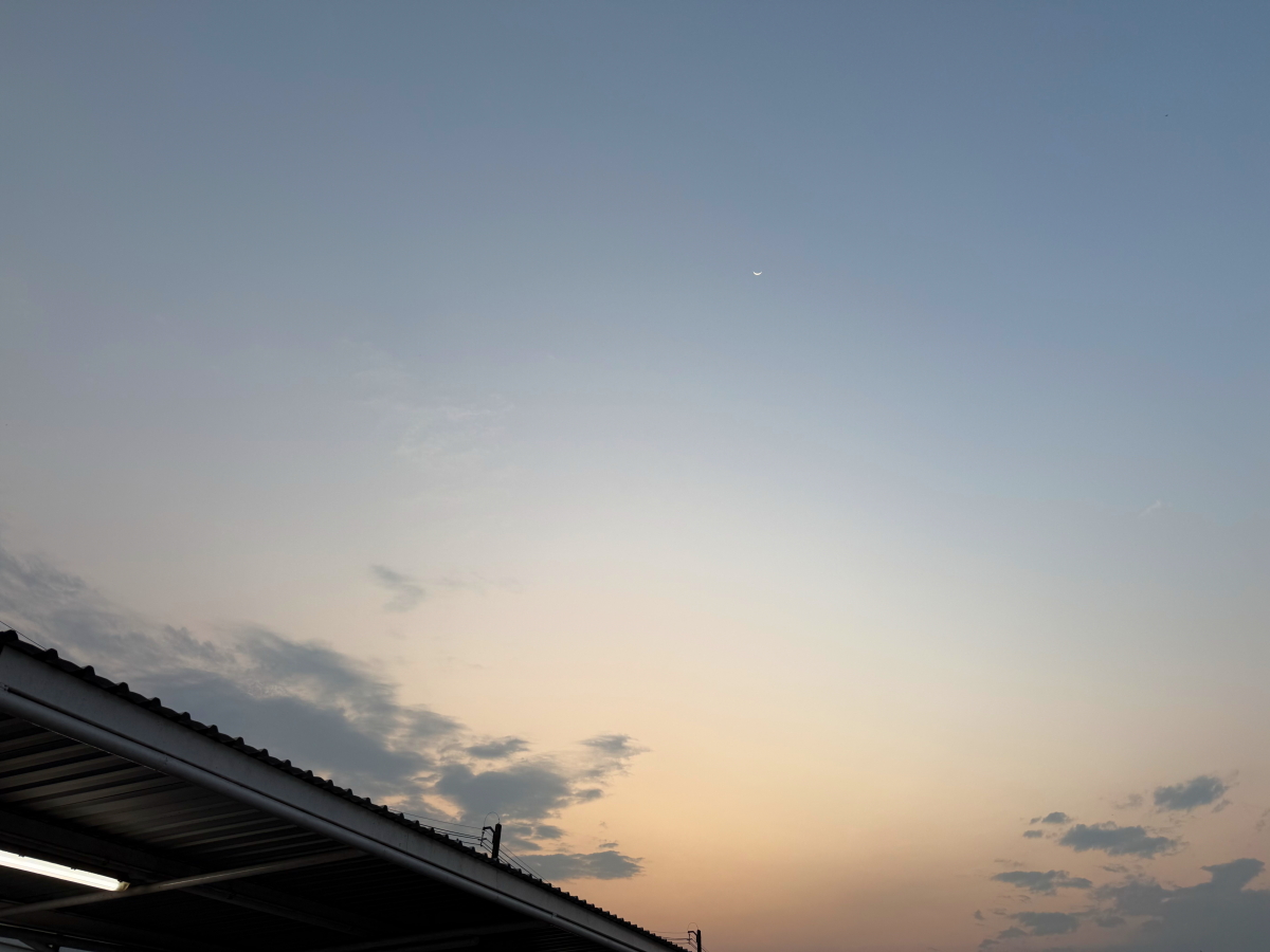 サッカー場の上に細いお月様が浮かびました