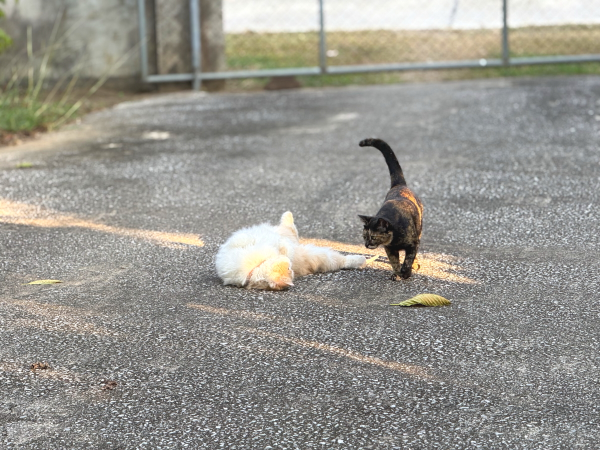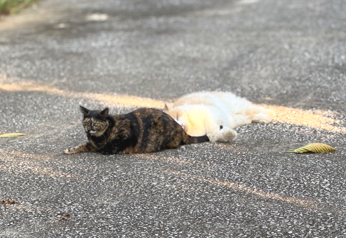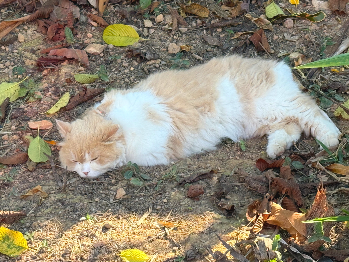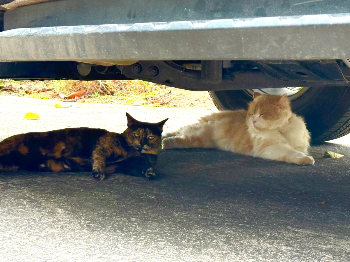 車の下から出て、日陰の冷えた土の上で寝転んでます
