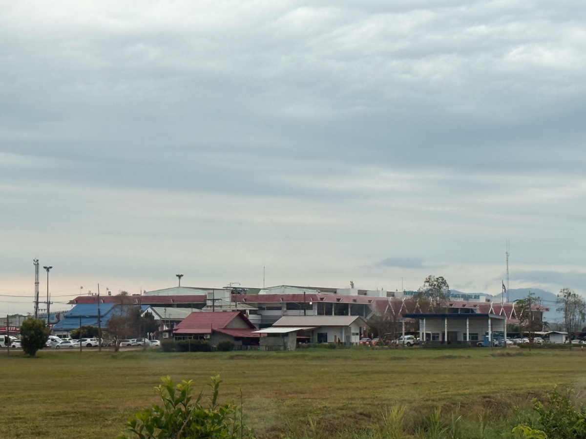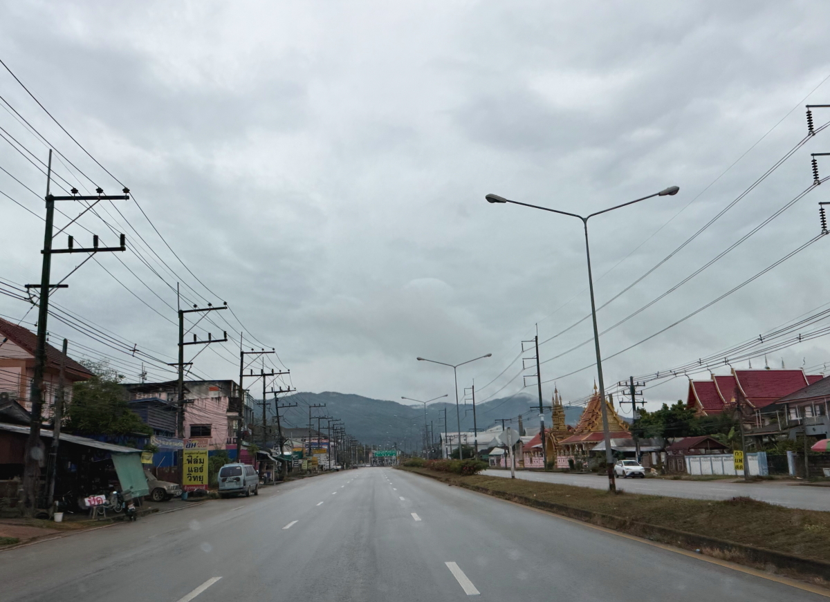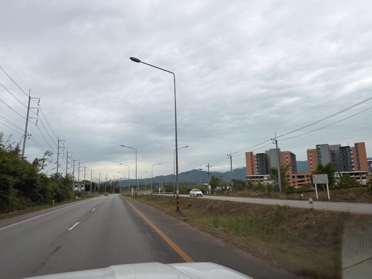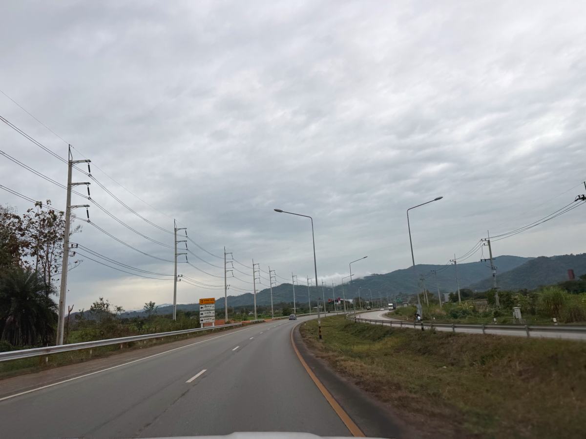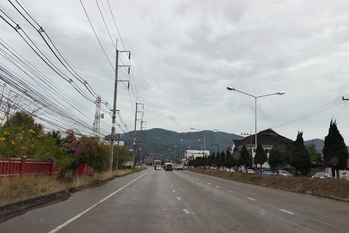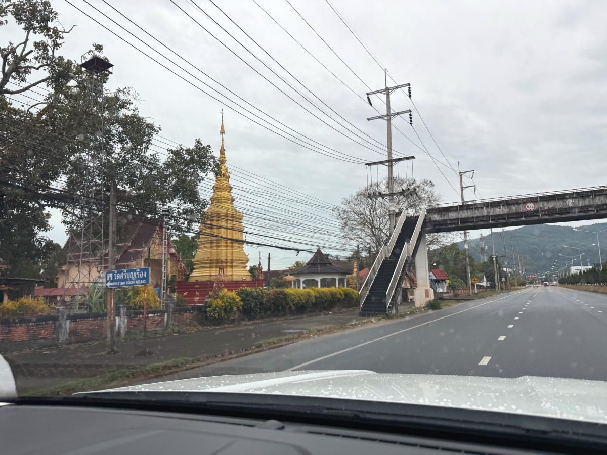国道を南下してメーチャンの街に向かうところ、道路の右はお寺、山々も霞んでます