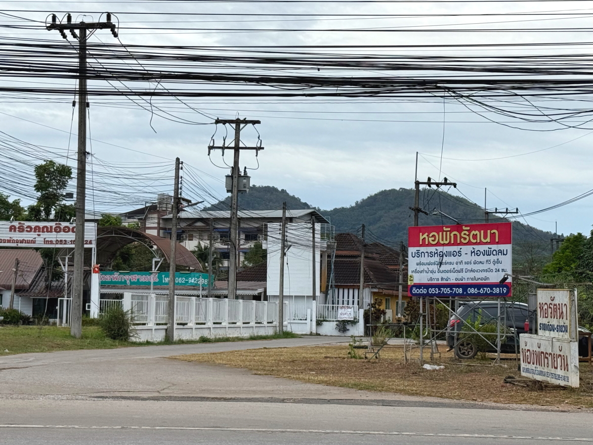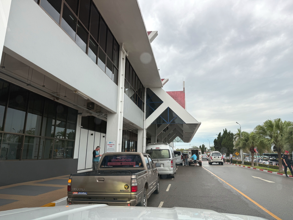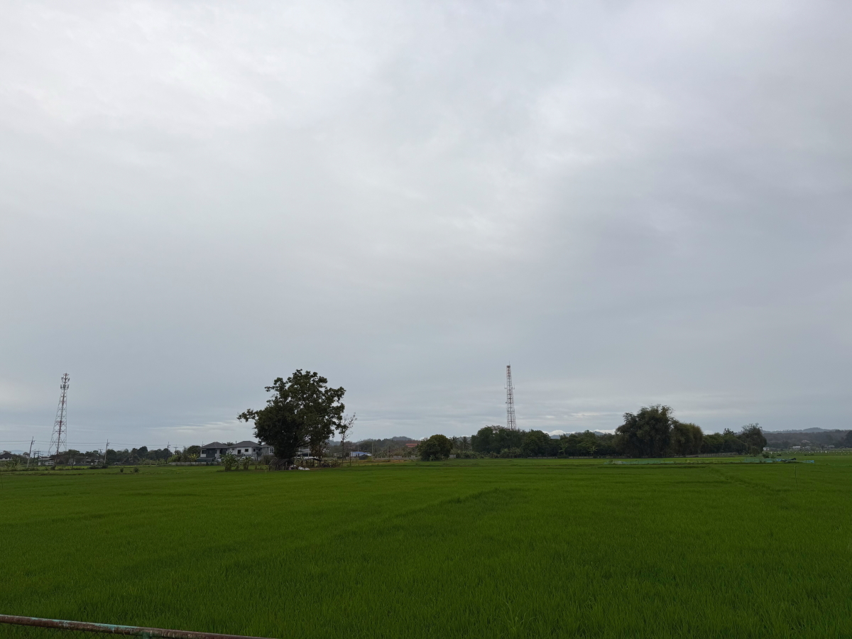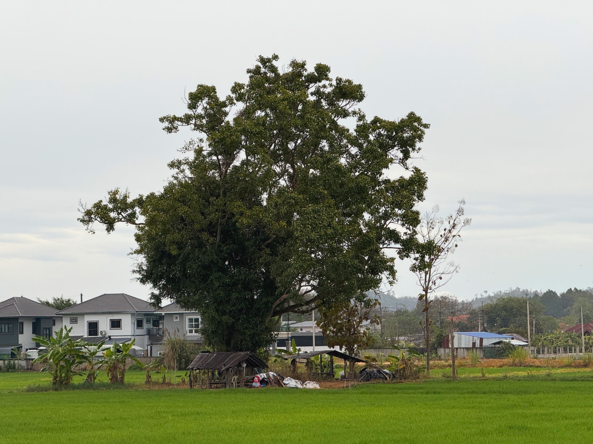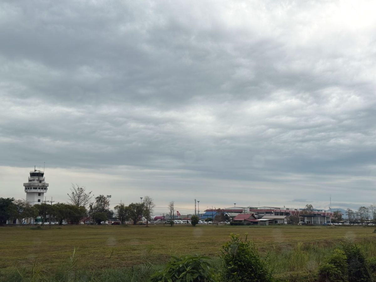 国道を南下してメーチャンの街に向かうところ、道路の右はお寺、山々も霞んでます