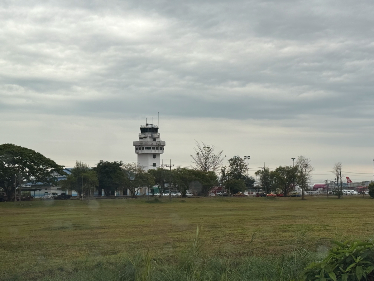 飛行場に到着、施設外の国道でちょっと時間調整、管制塔が見えてます