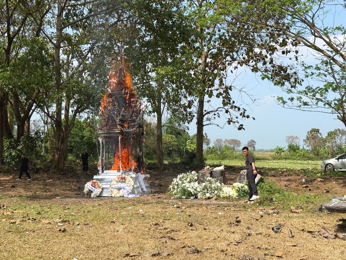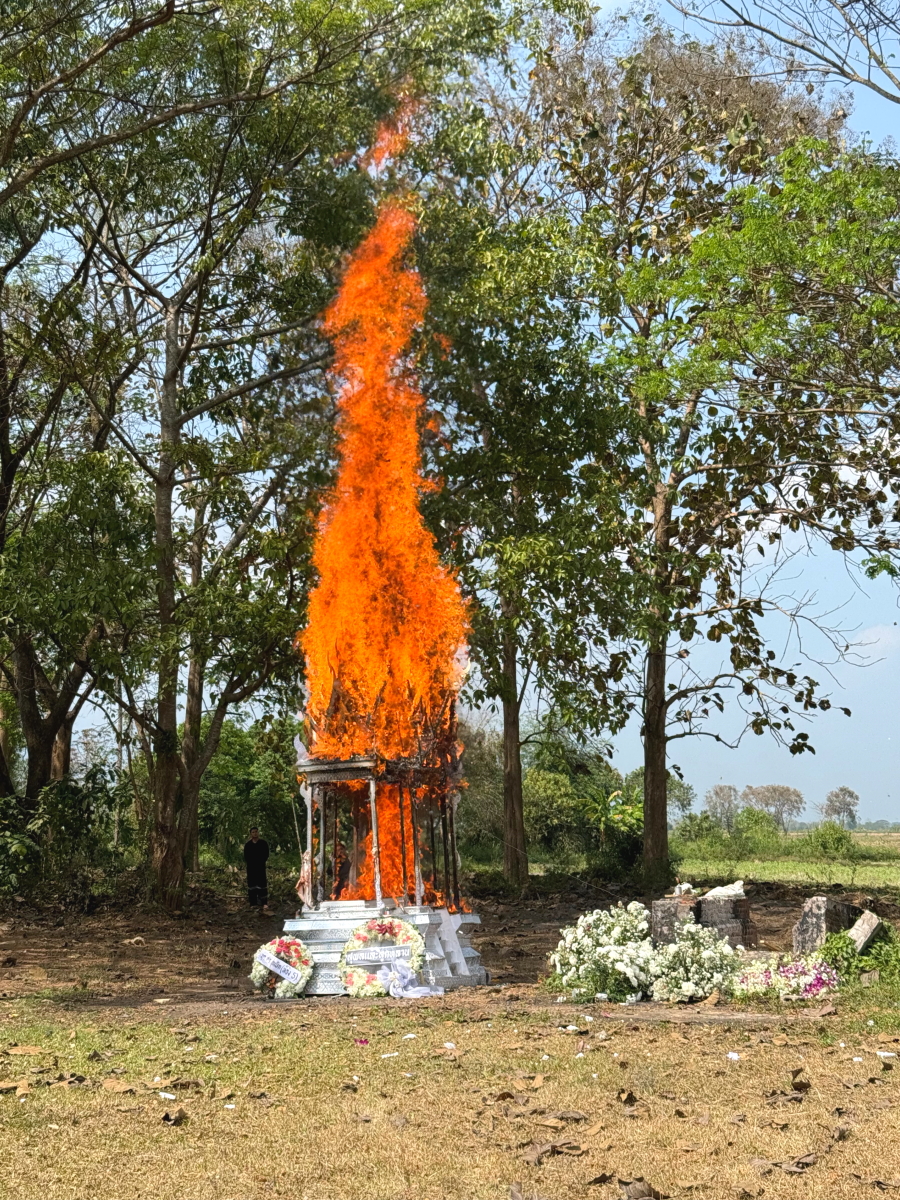 一連の最終イベント、ヤグラの後ろが窯ですが故人の遺言により、野焼きで荼毘に付します