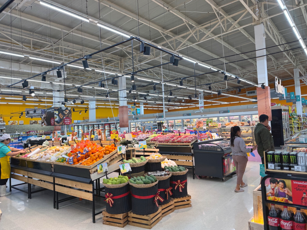 夕暮れの中をスーパーに移動、国道沿いのお店はライトアップの時間