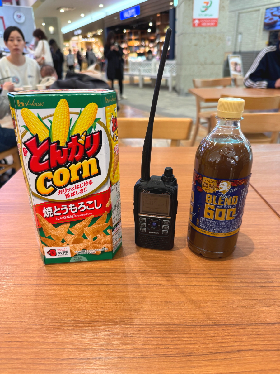 前日と同じバターン、ベルモールのフードコートでおつまみ、無線機はアマチュア無線のハンディー機