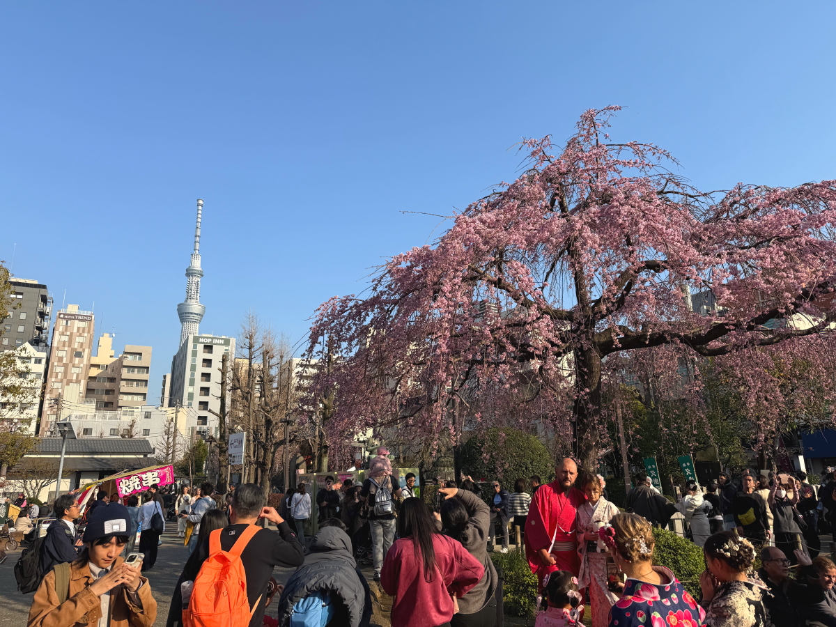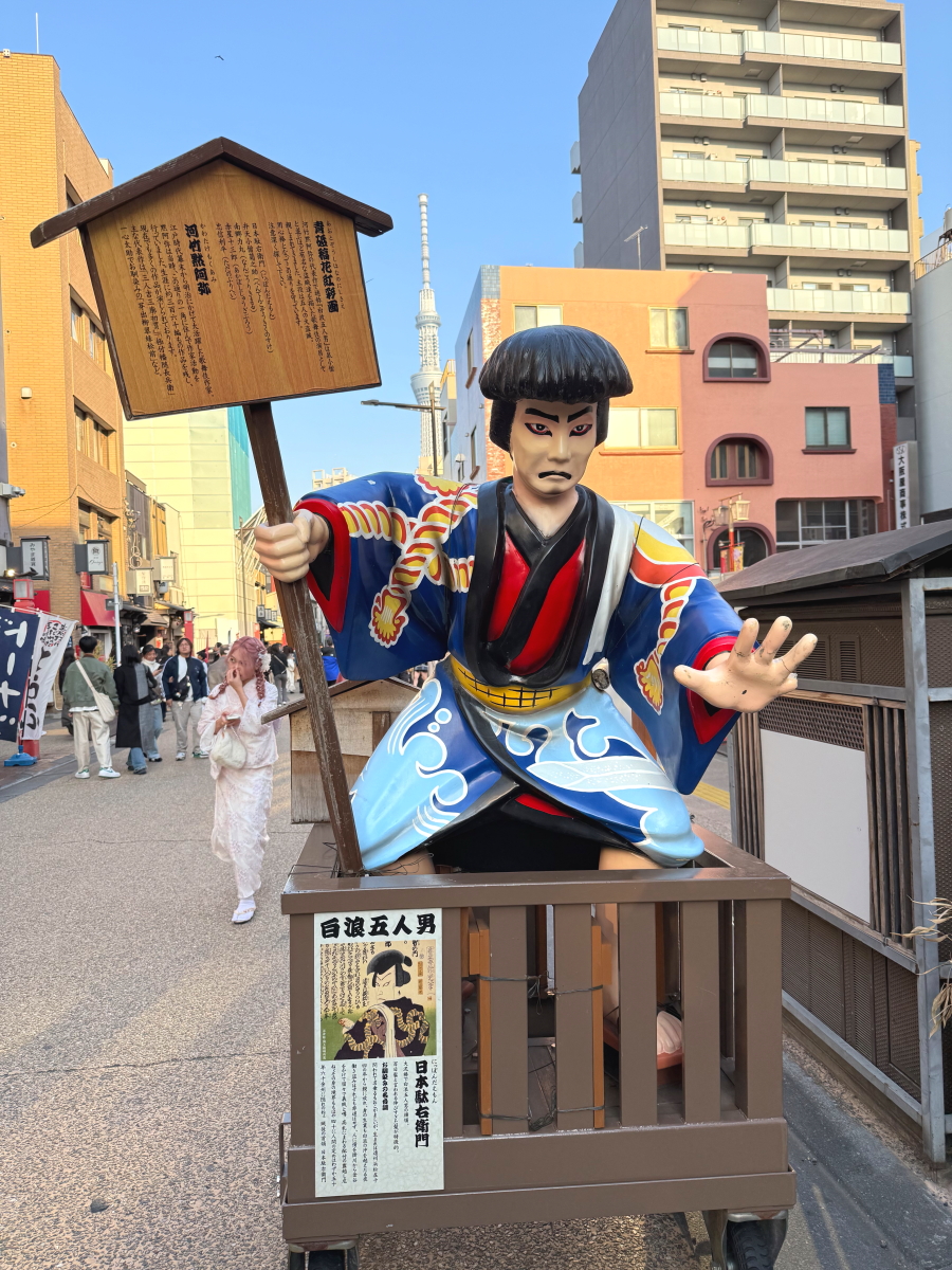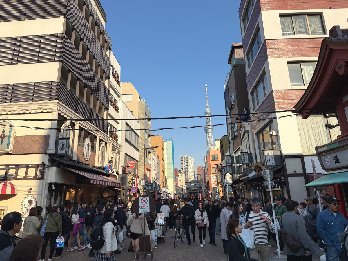 浅草に歩いて行くと後ろにスカイツリー
